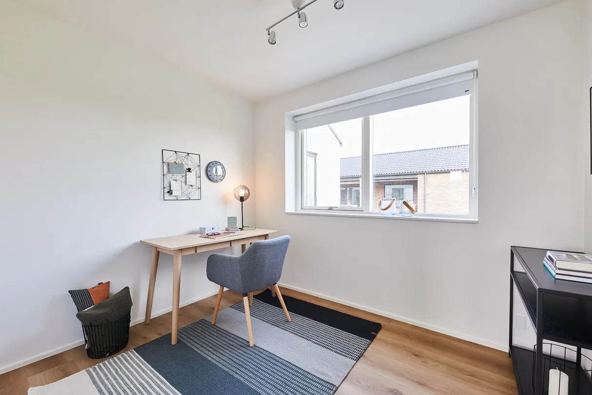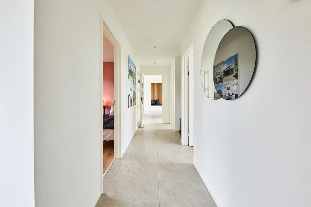 Entré med hall-effekt, alkove og læfyldt terrasse.