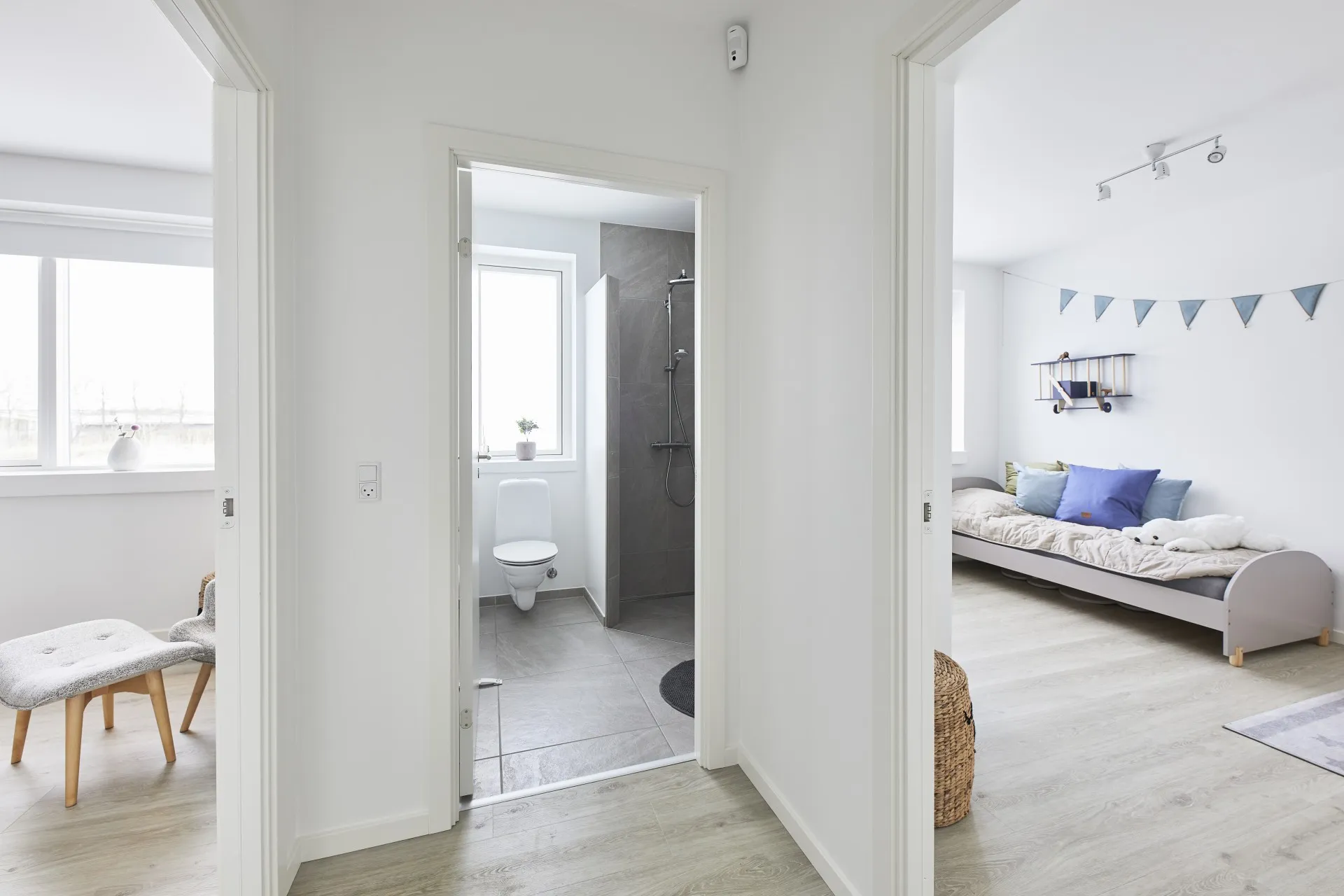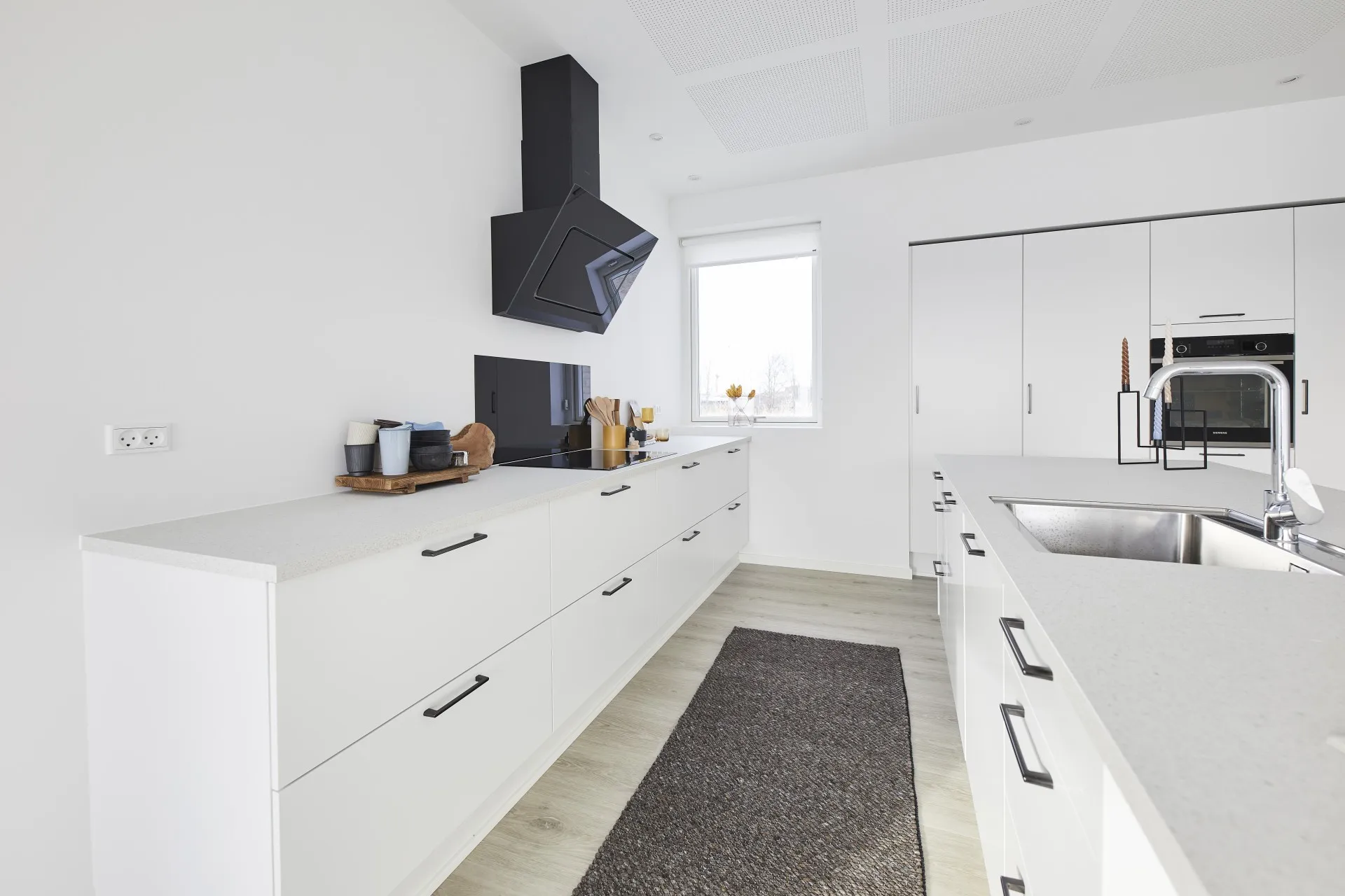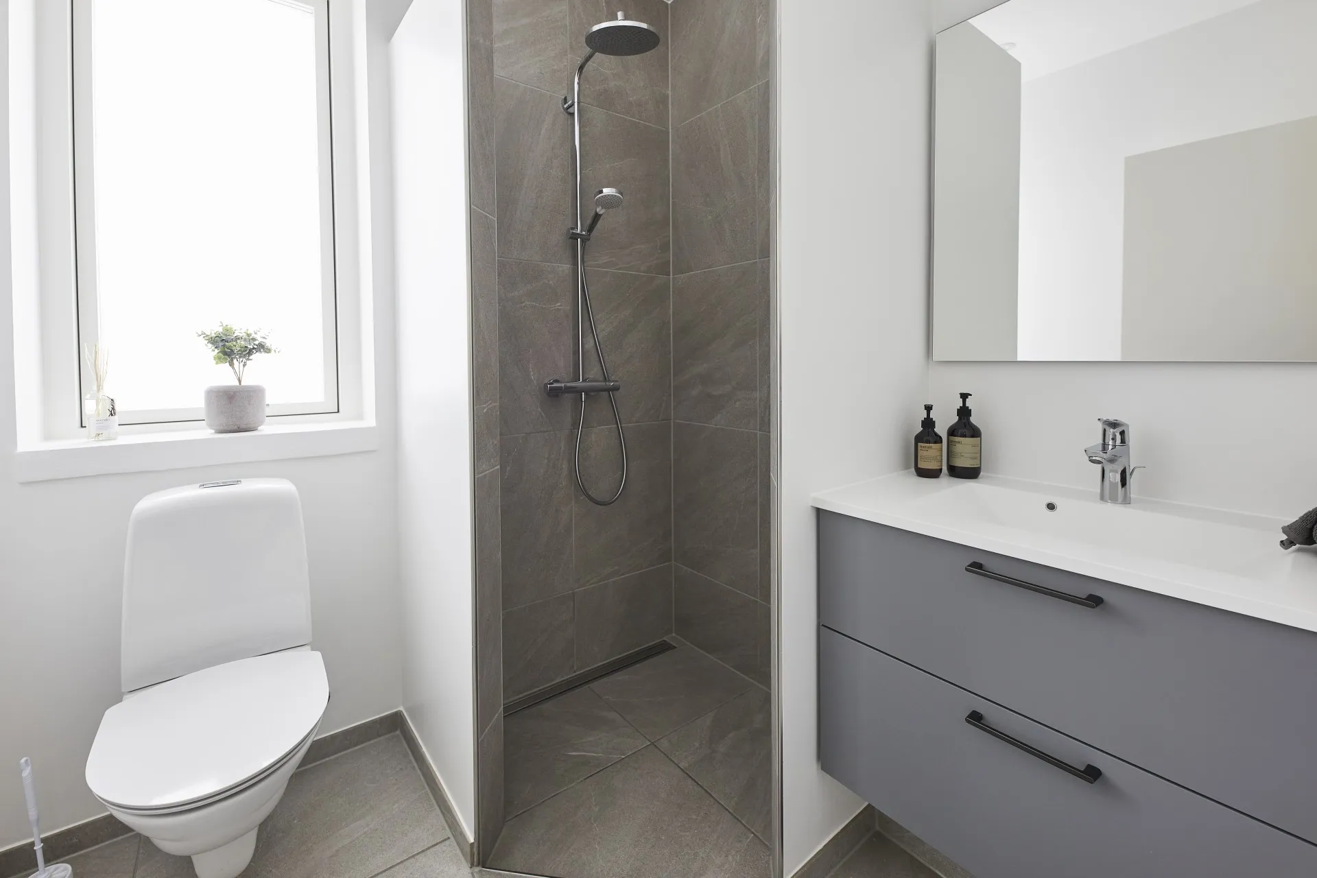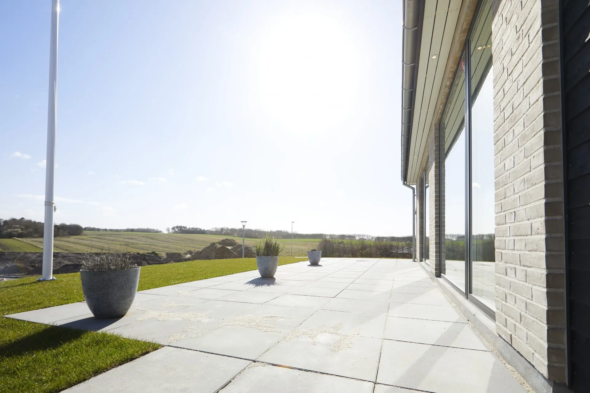 Mursten: Limoux med grå/hvid fuge. Klinker: Atrium Tabor Perla. Gulv: Hybel 90