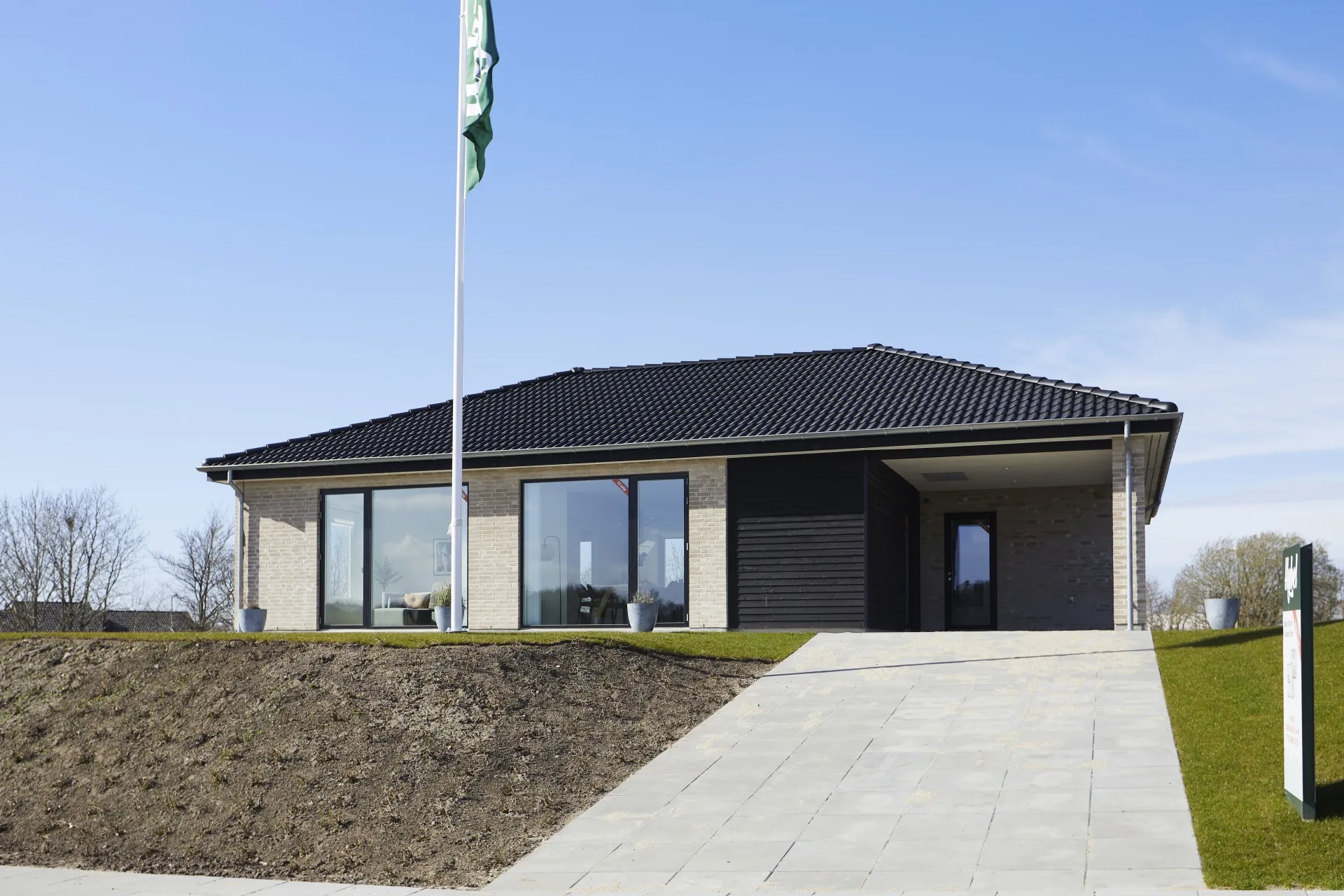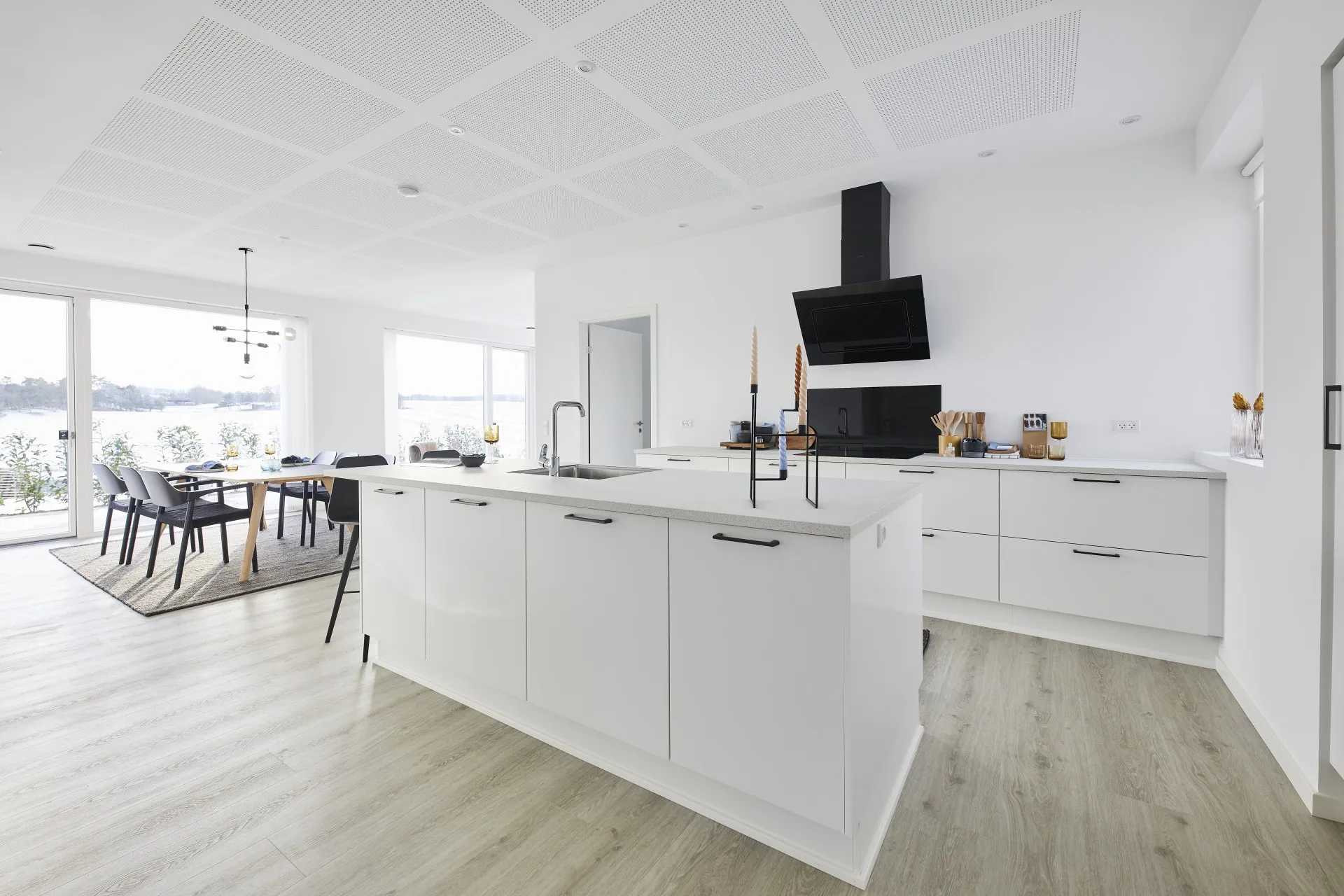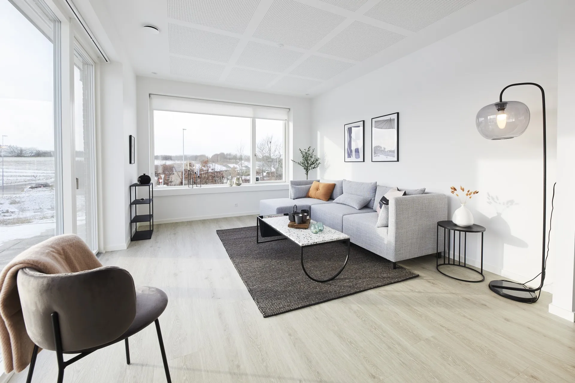 Mursten: Limoux med grå/hvid fuge. Klinker: Atrium Tabor Perla. Gulv: Hybel 90