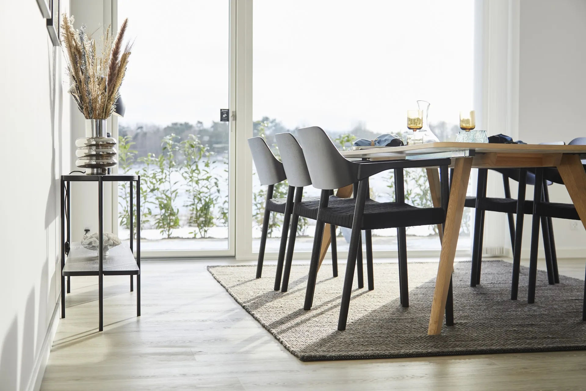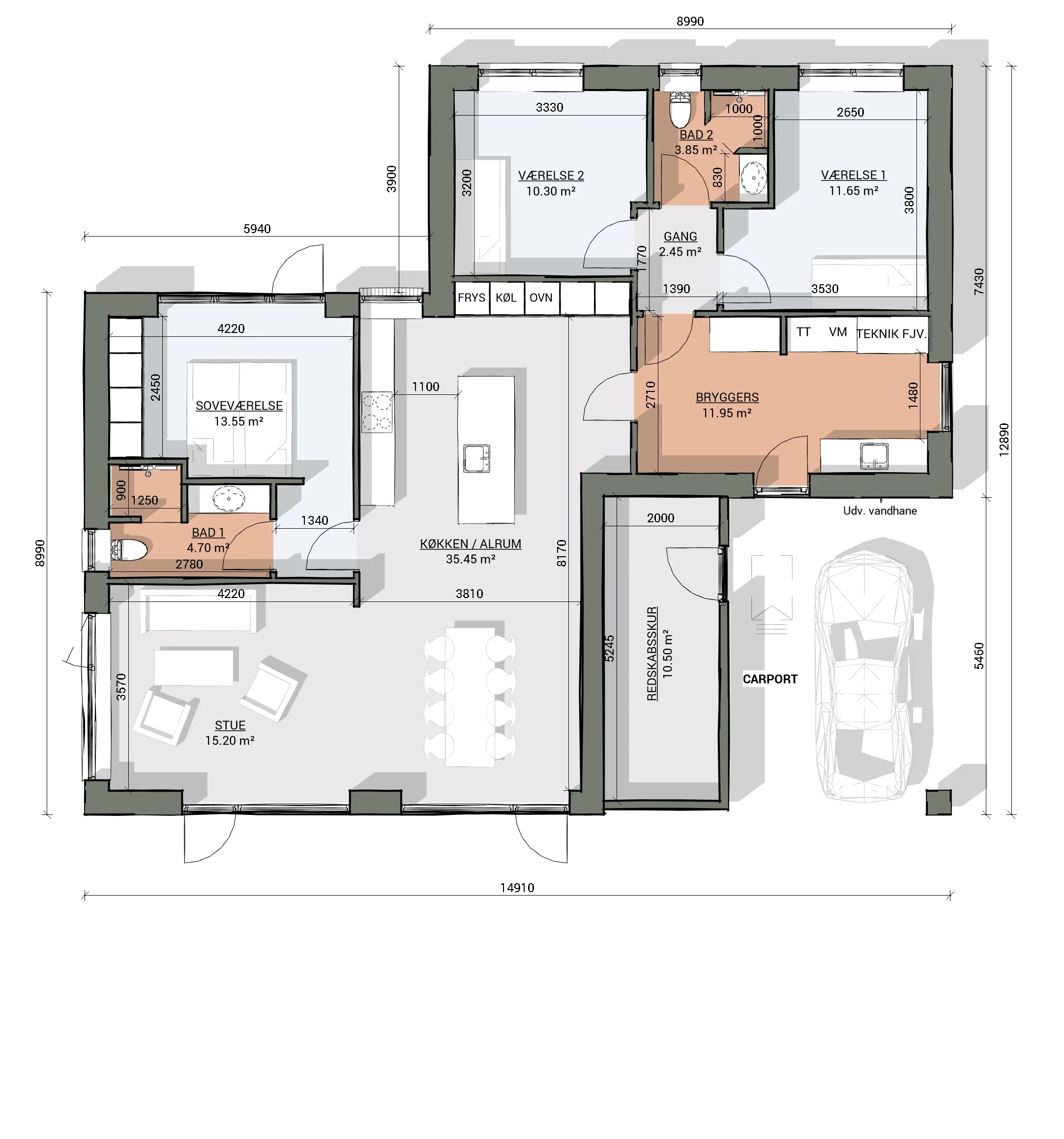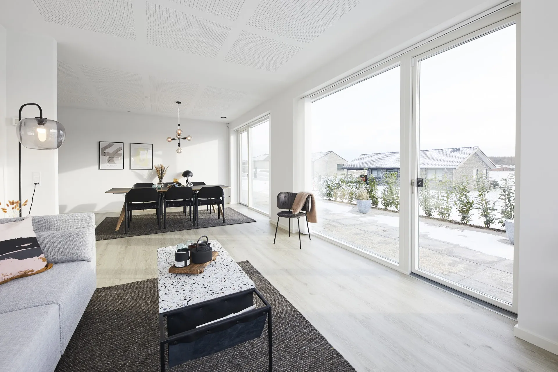 Store udsigtsvinduer, indgang gennem bryggerset samt køkken/alrum og stue i ét.
