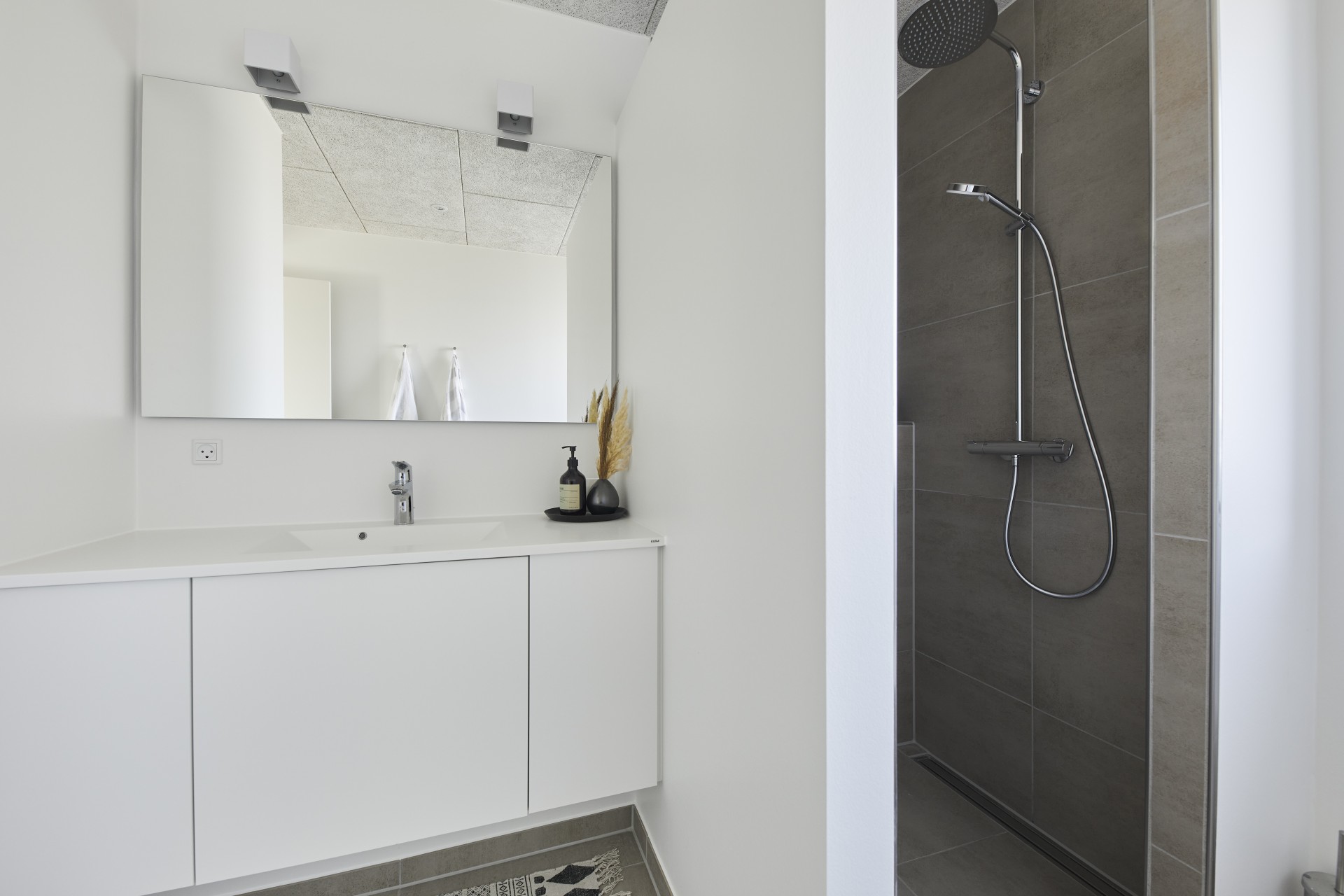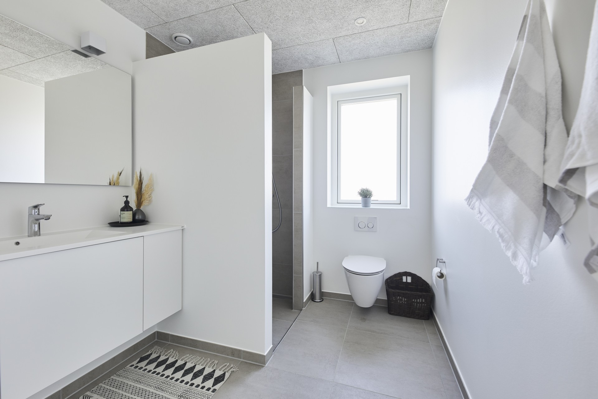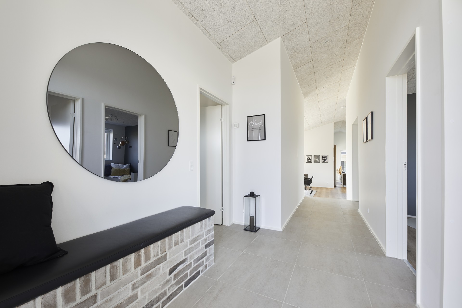 Siddebænk i entréen, stort bryggers og overdækket terrasse.