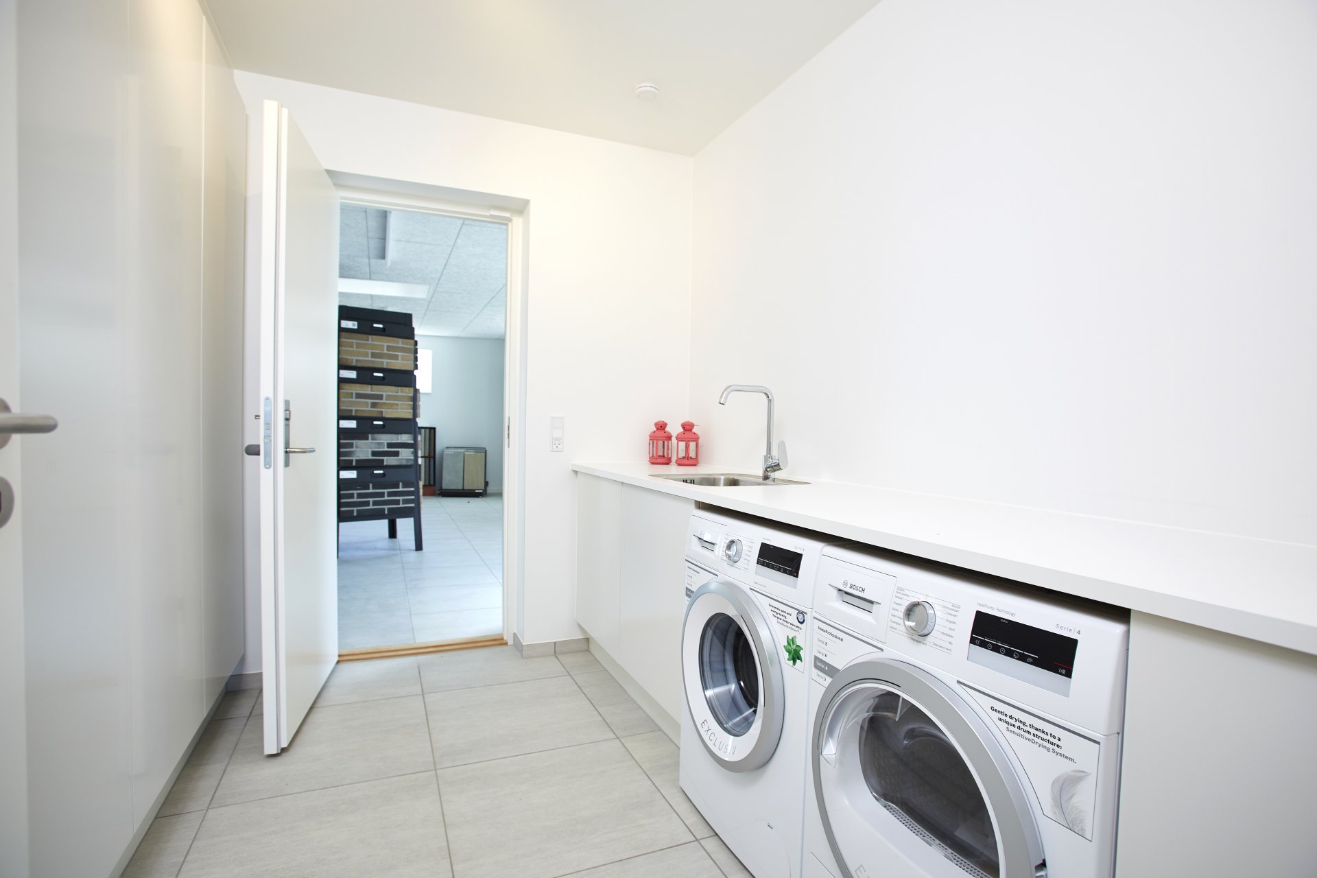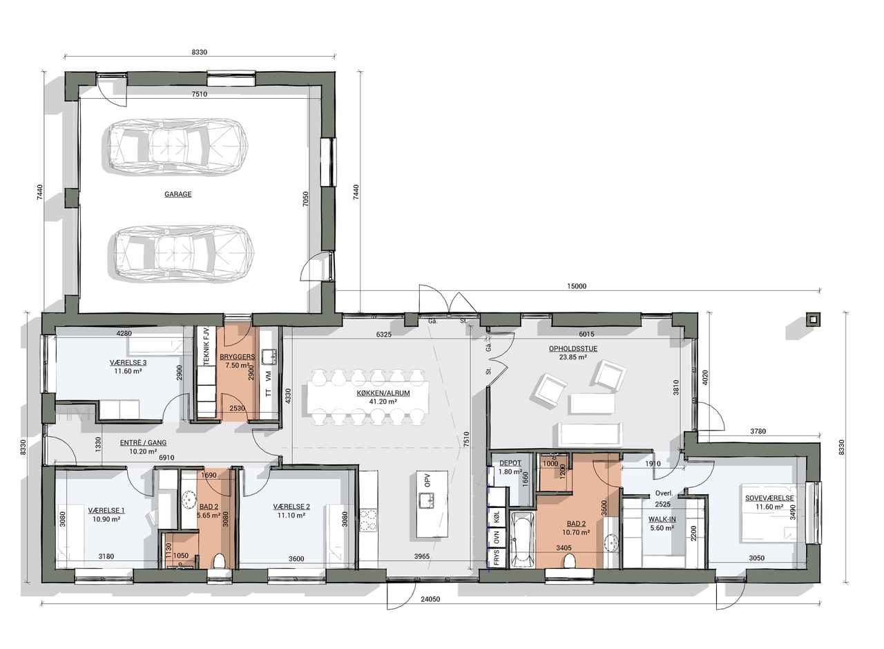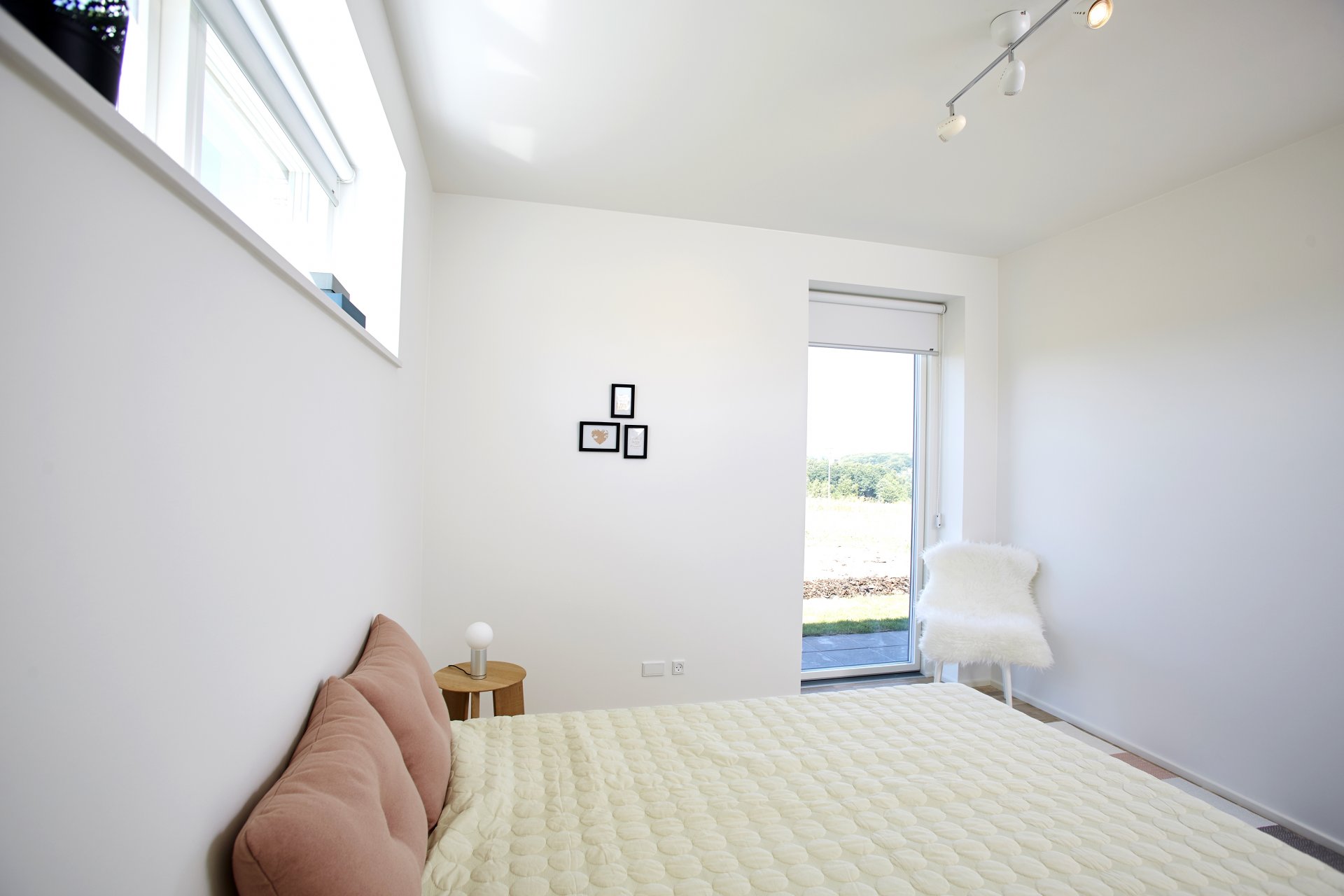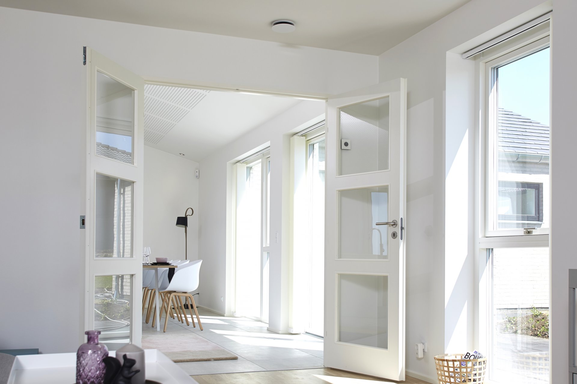 Dobbelte franske døre som rumdeler, trælåger i inventar, dobbelt garage, gulv-til-loft vinduespartier, walk-in og køkken/alrum med højt til loftet.