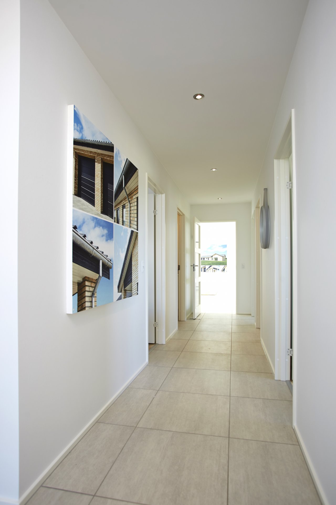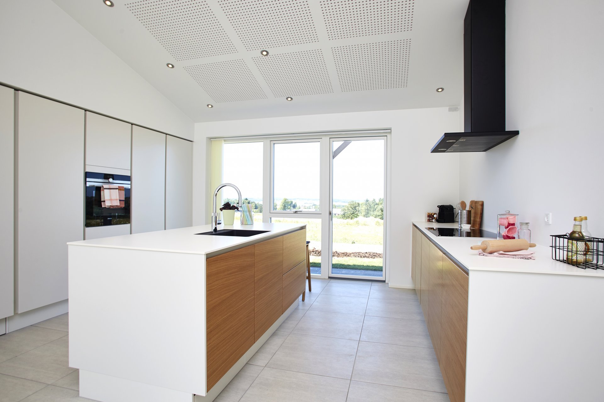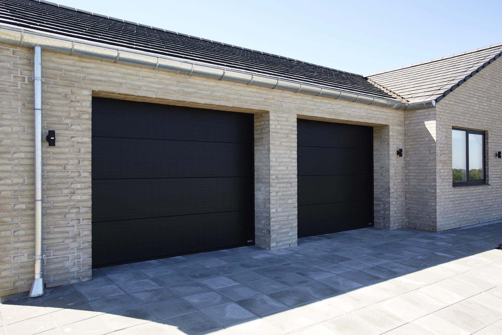 Dobbelte franske døre som rumdeler, trælåger i inventar, dobbelt garage, gulv-til-loft vinduespartier, walk-in og køkken/alrum med højt til loftet.