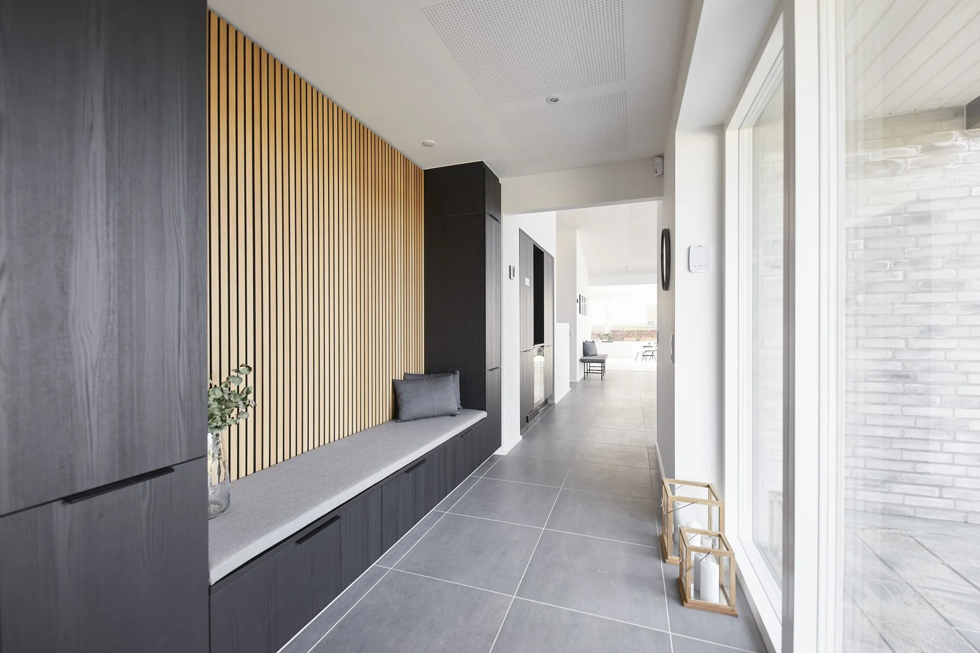 Lys entré, marmorlignende sten i badeværelser og multirum.