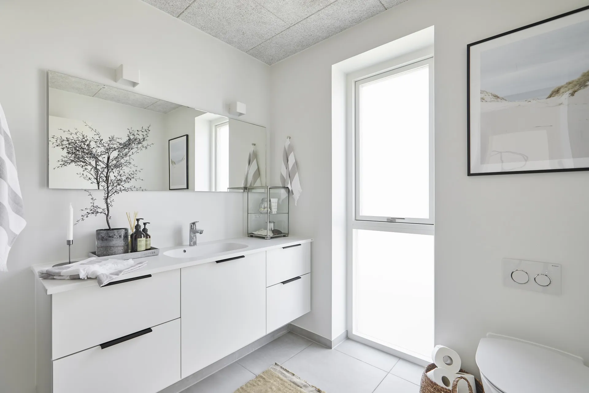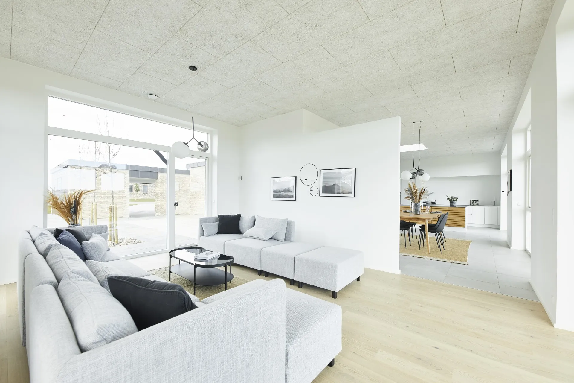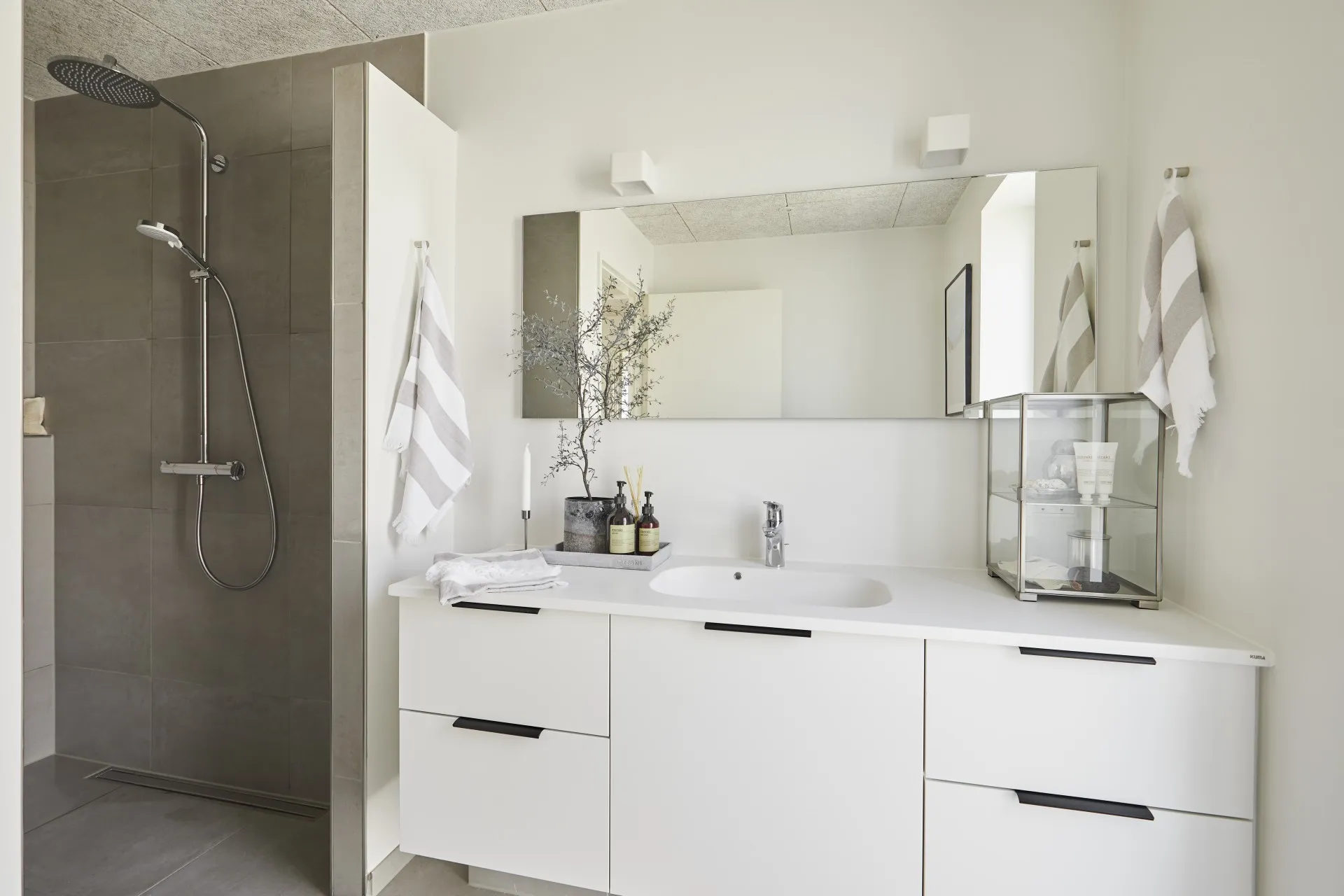 Mursten: Cold Hawaii med grå/hvid fuge. Klinker: Salem Cenzia. Gulv: Midi plank-eg