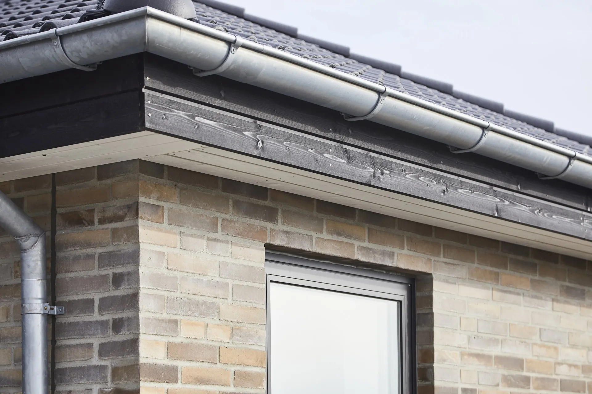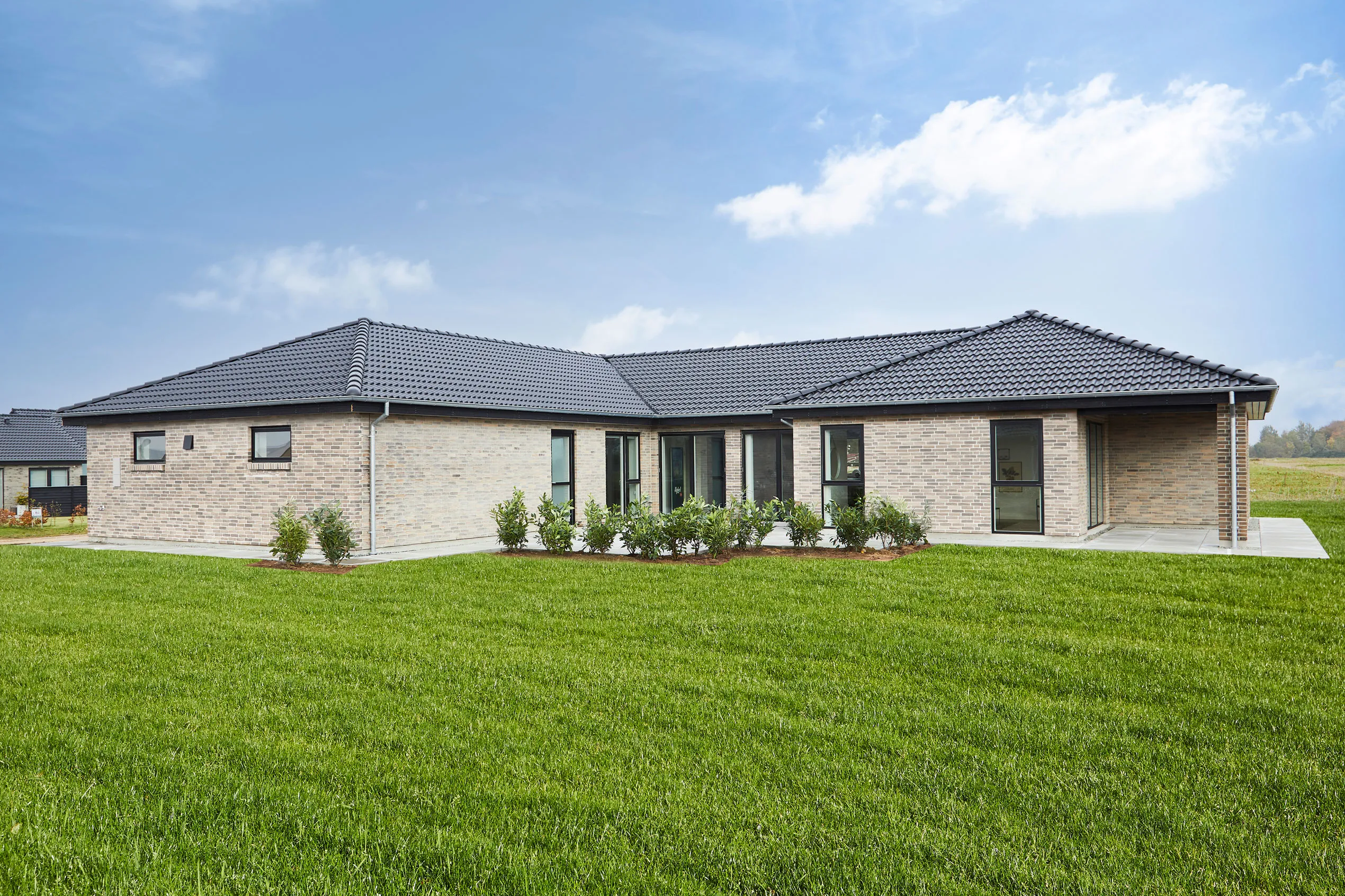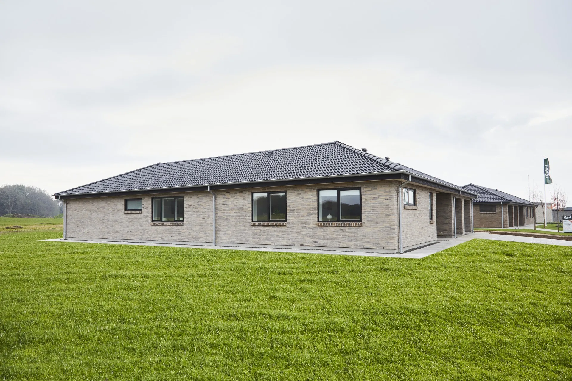 Vinkelhus med valmtag med udhæng.