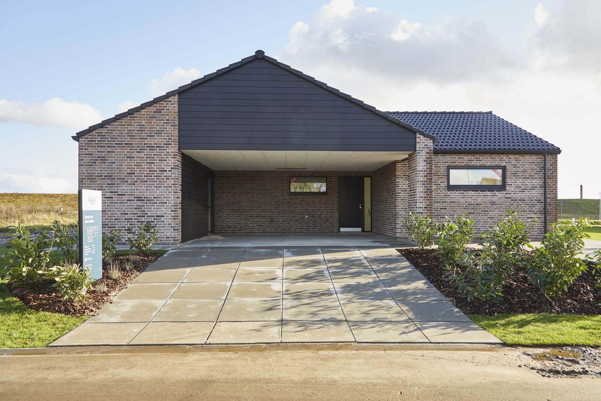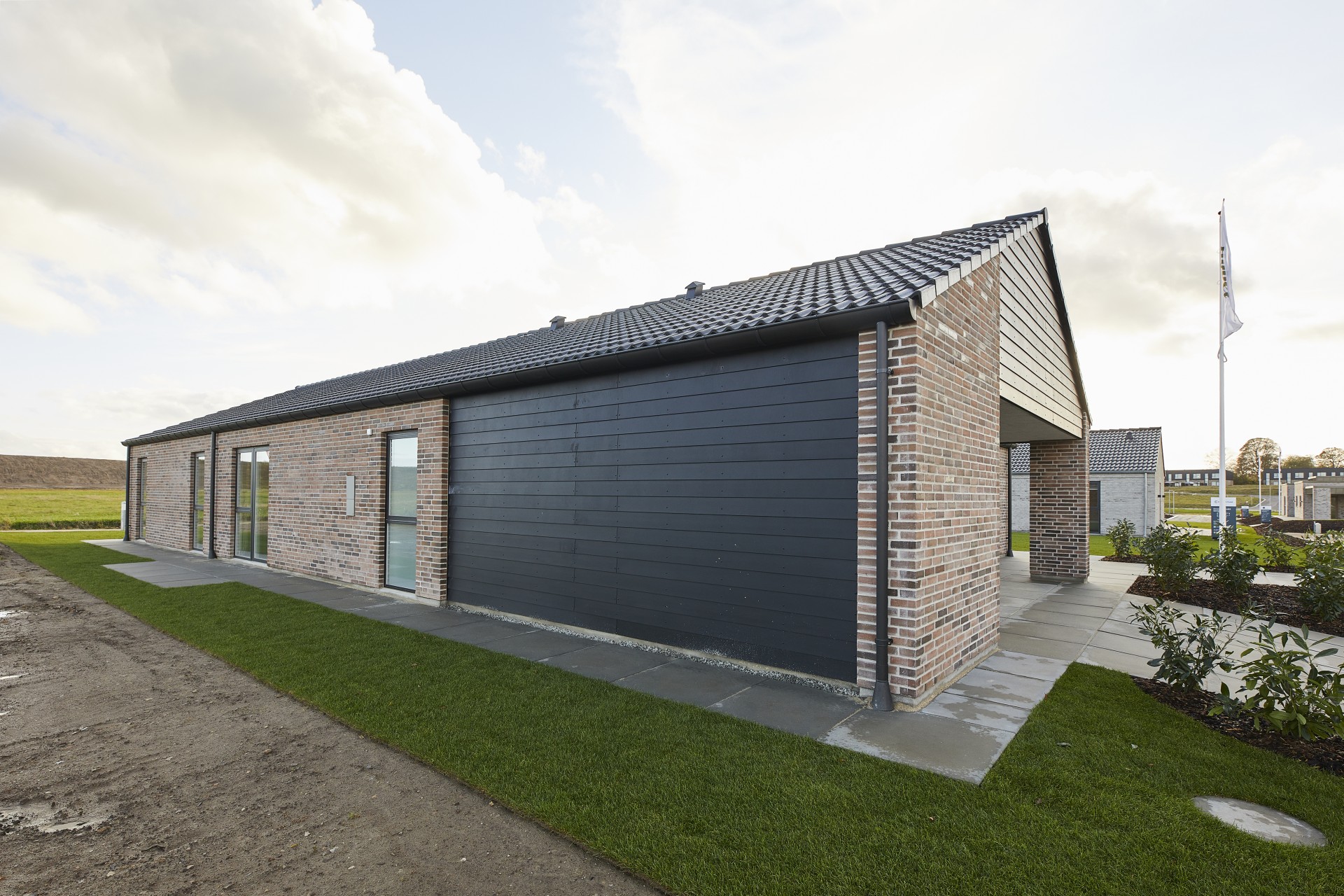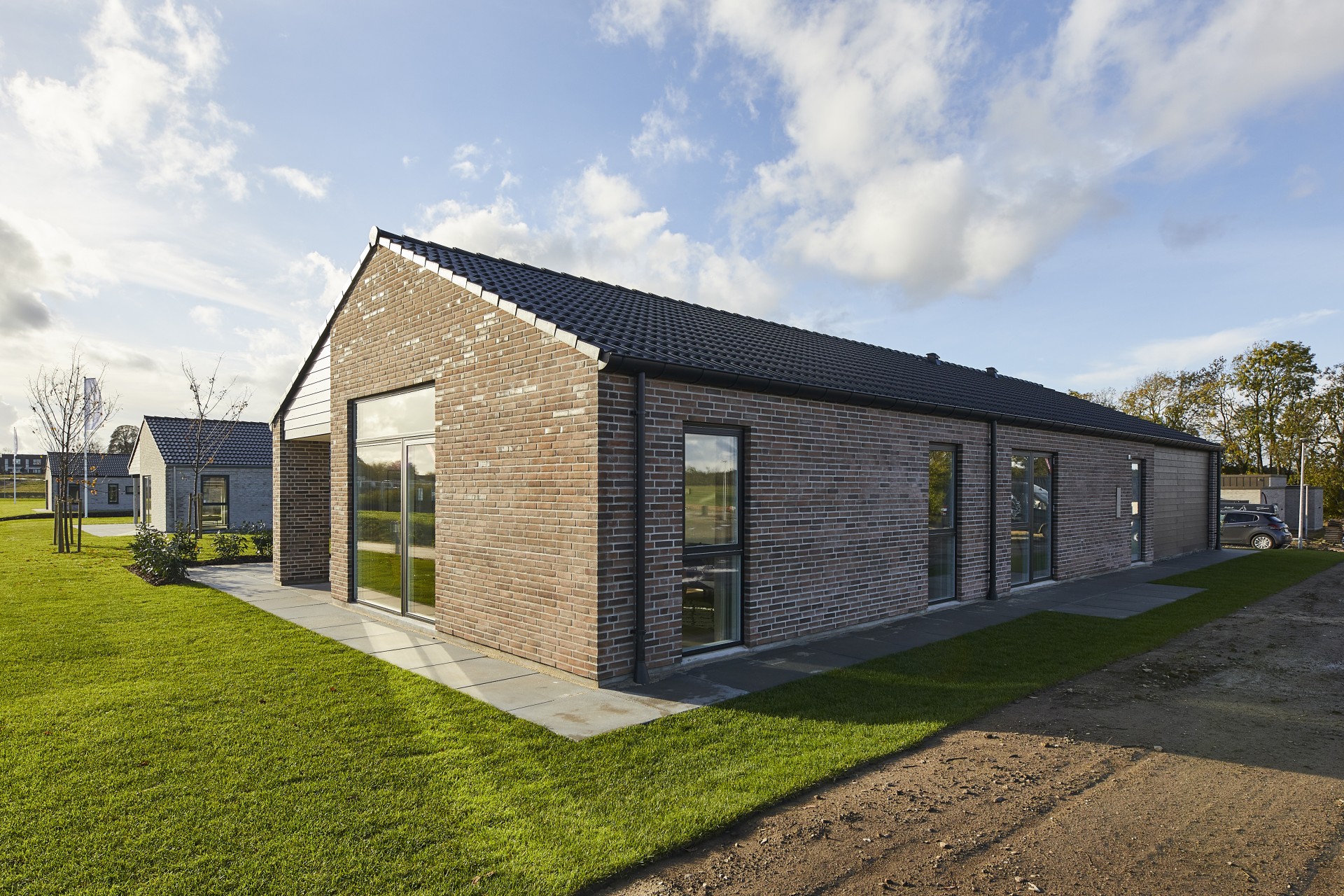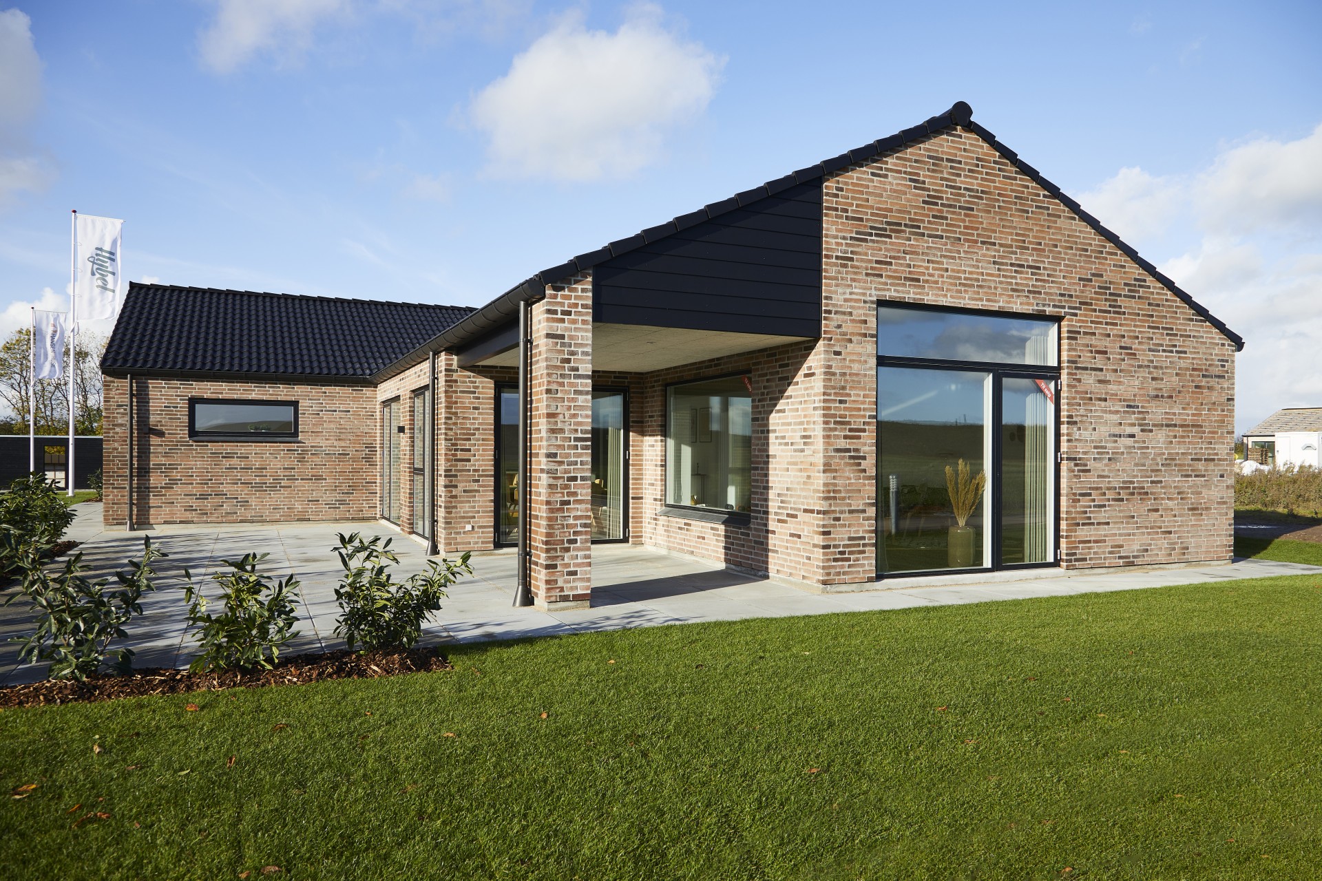 Forskudt vinkelhus med saddeltag uden udhæng.