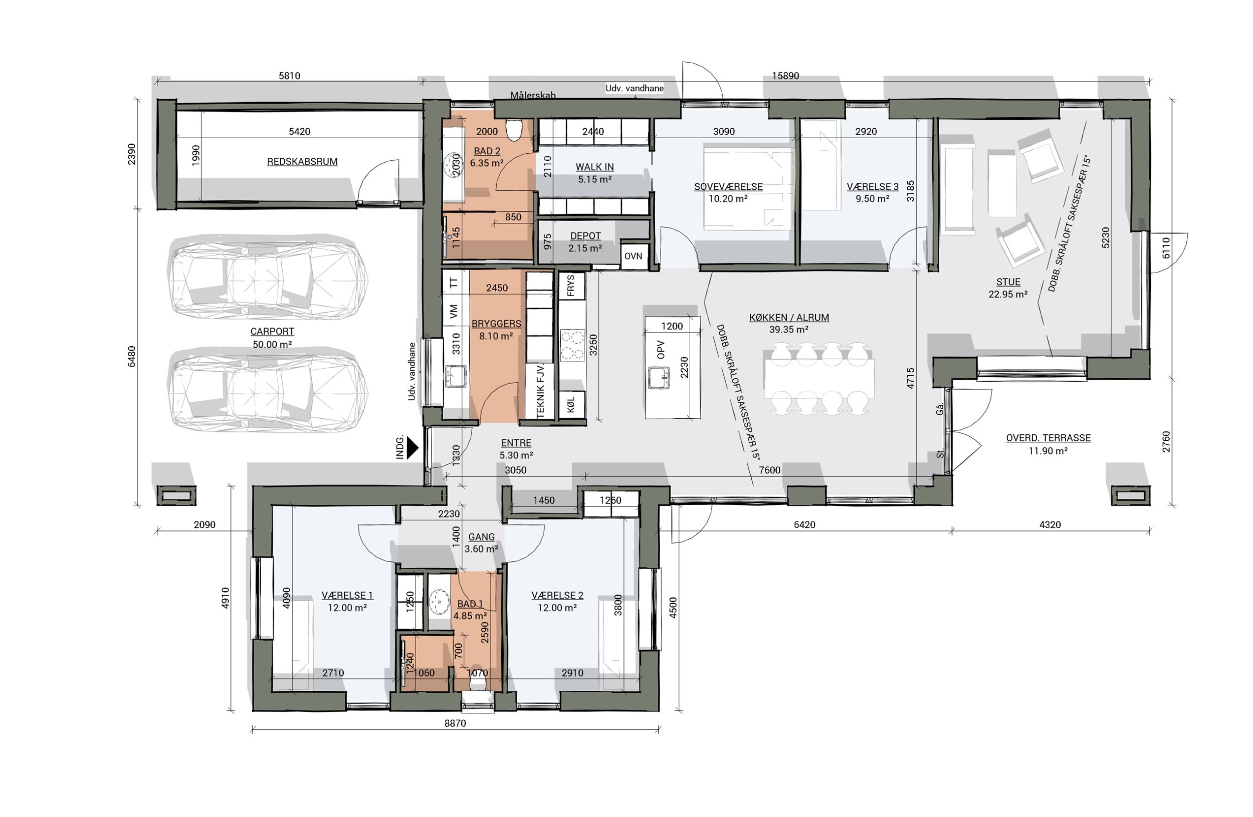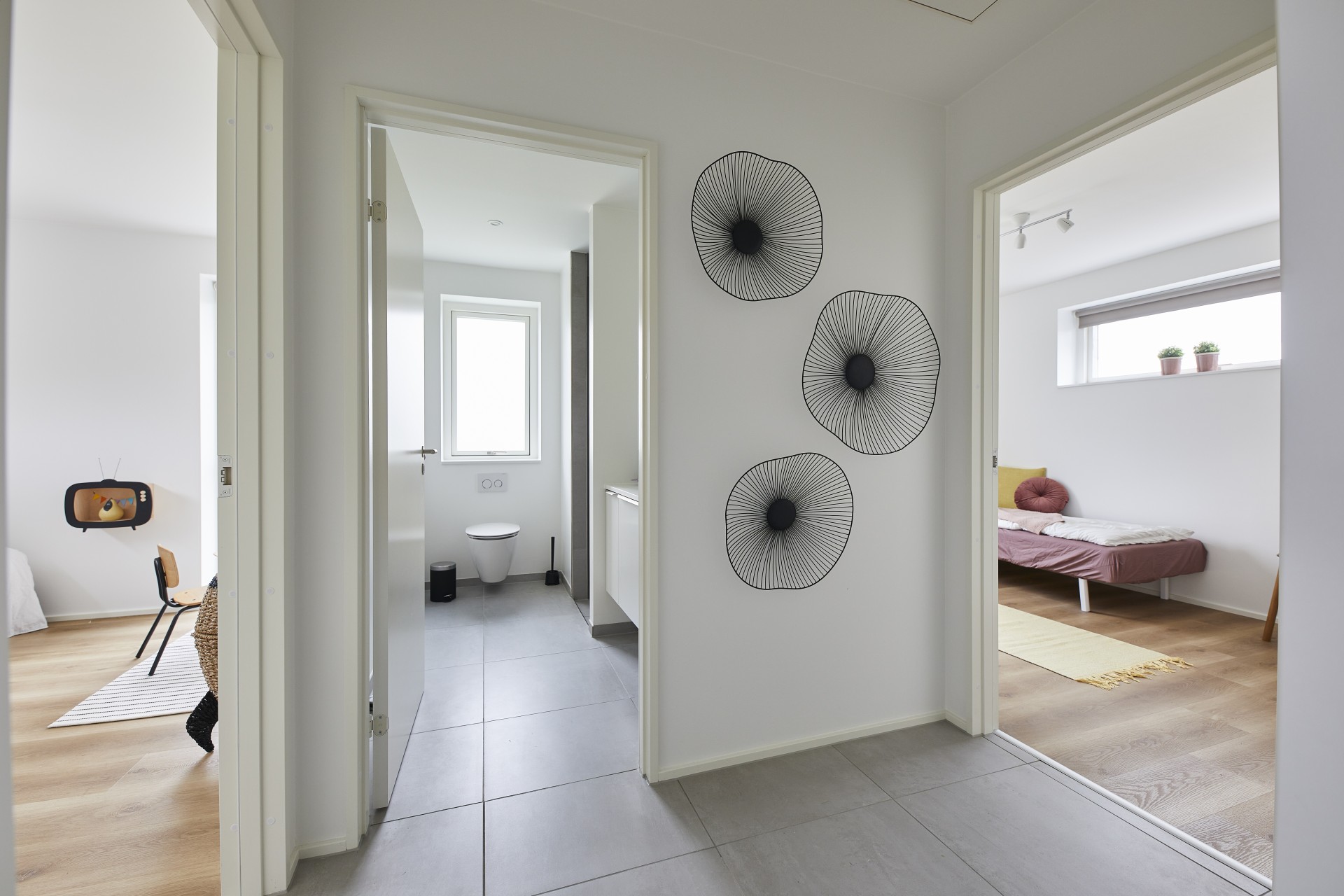 Walk-in-closet, skjult depotrum og skrålofter i K/A og stue