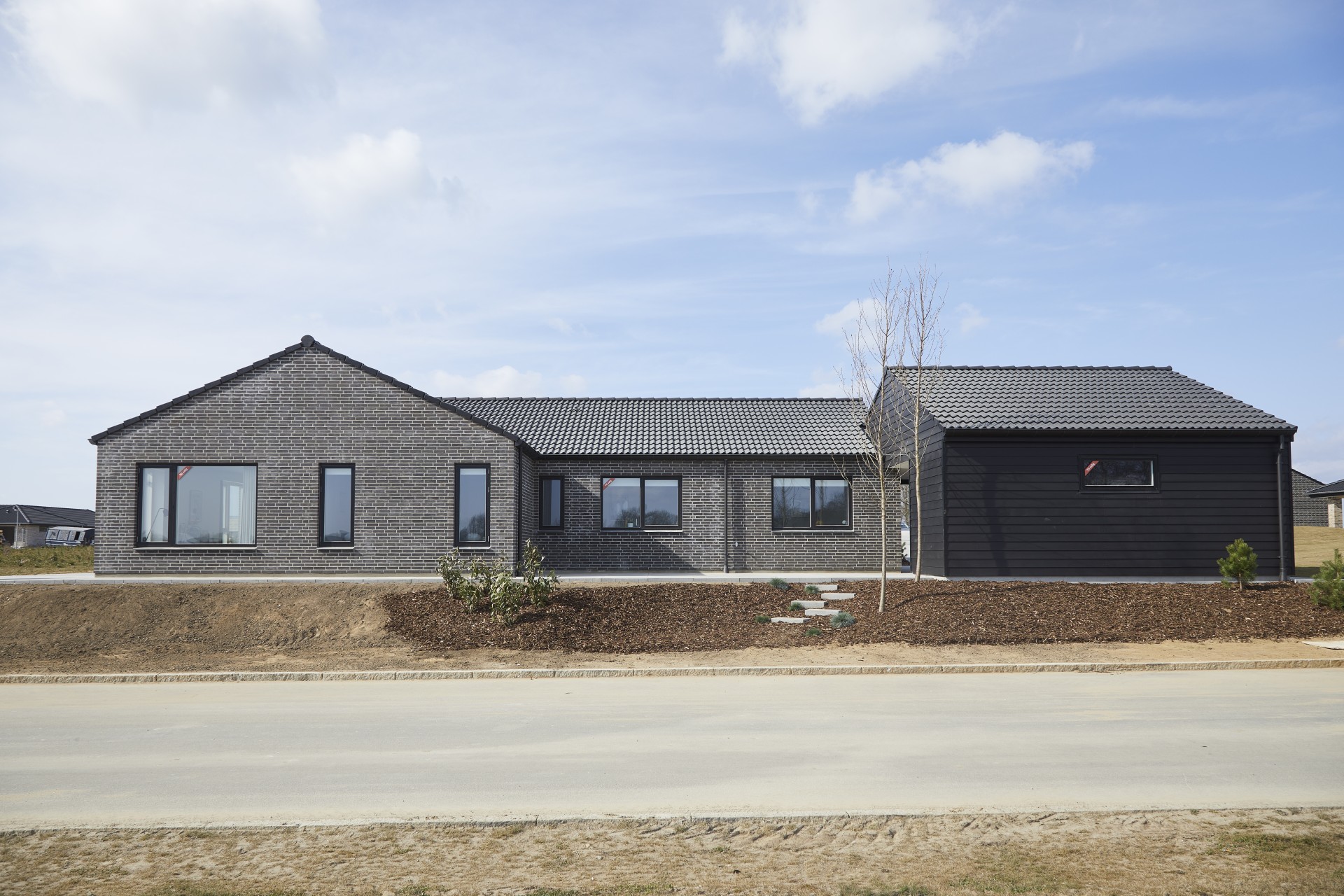 Forskudt vinkelhus med saddeltag uden udhæng.