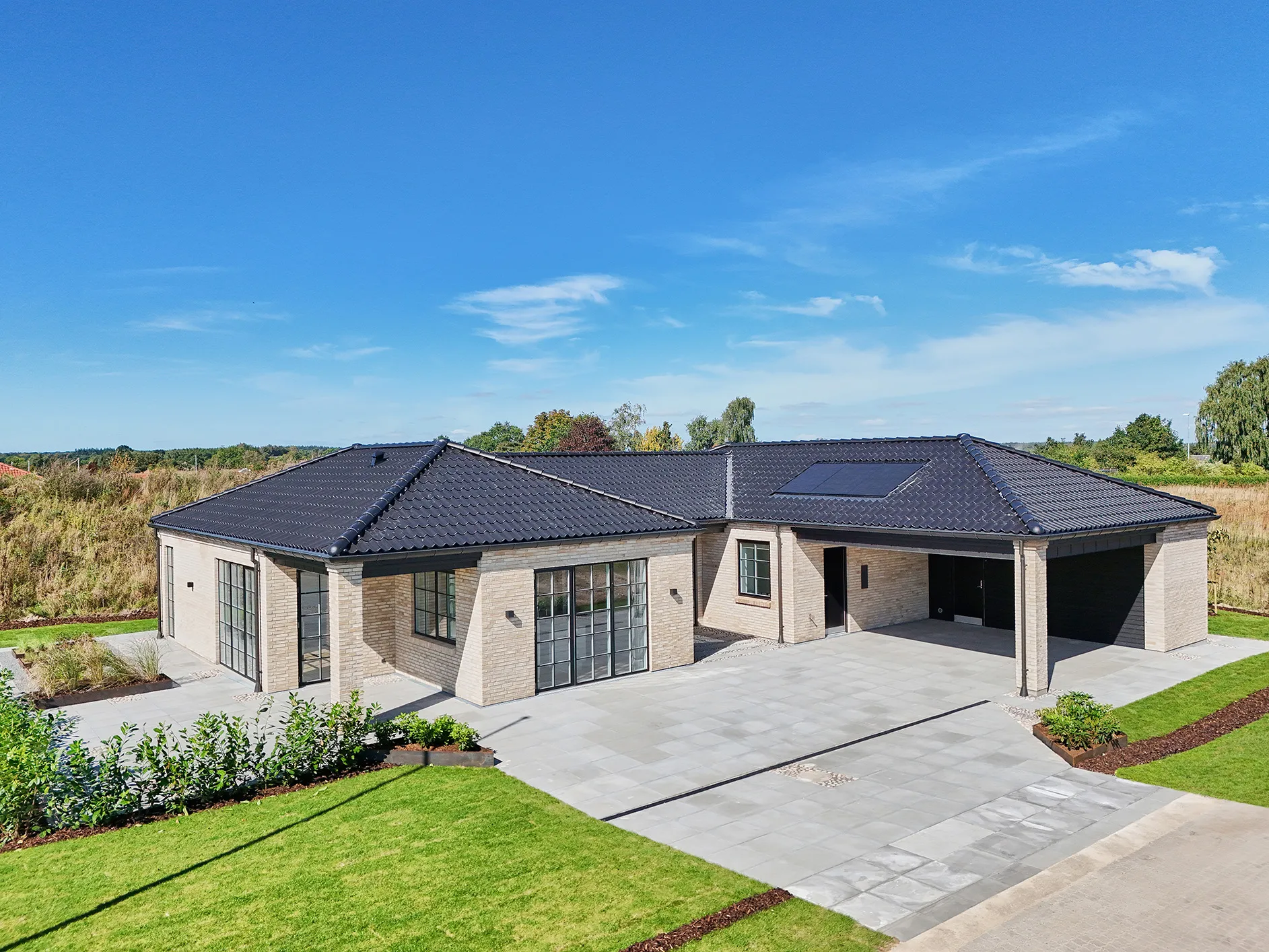 Når I ankommer, bliver I mødt af et lækkert H-hus med dobbelt carport, hvor I kan parkere bilen. Dertil har I også tilhørende redskabsrum.
