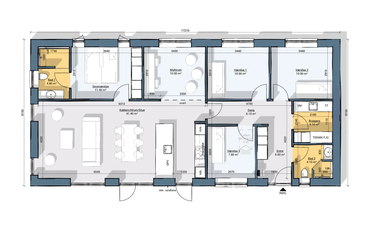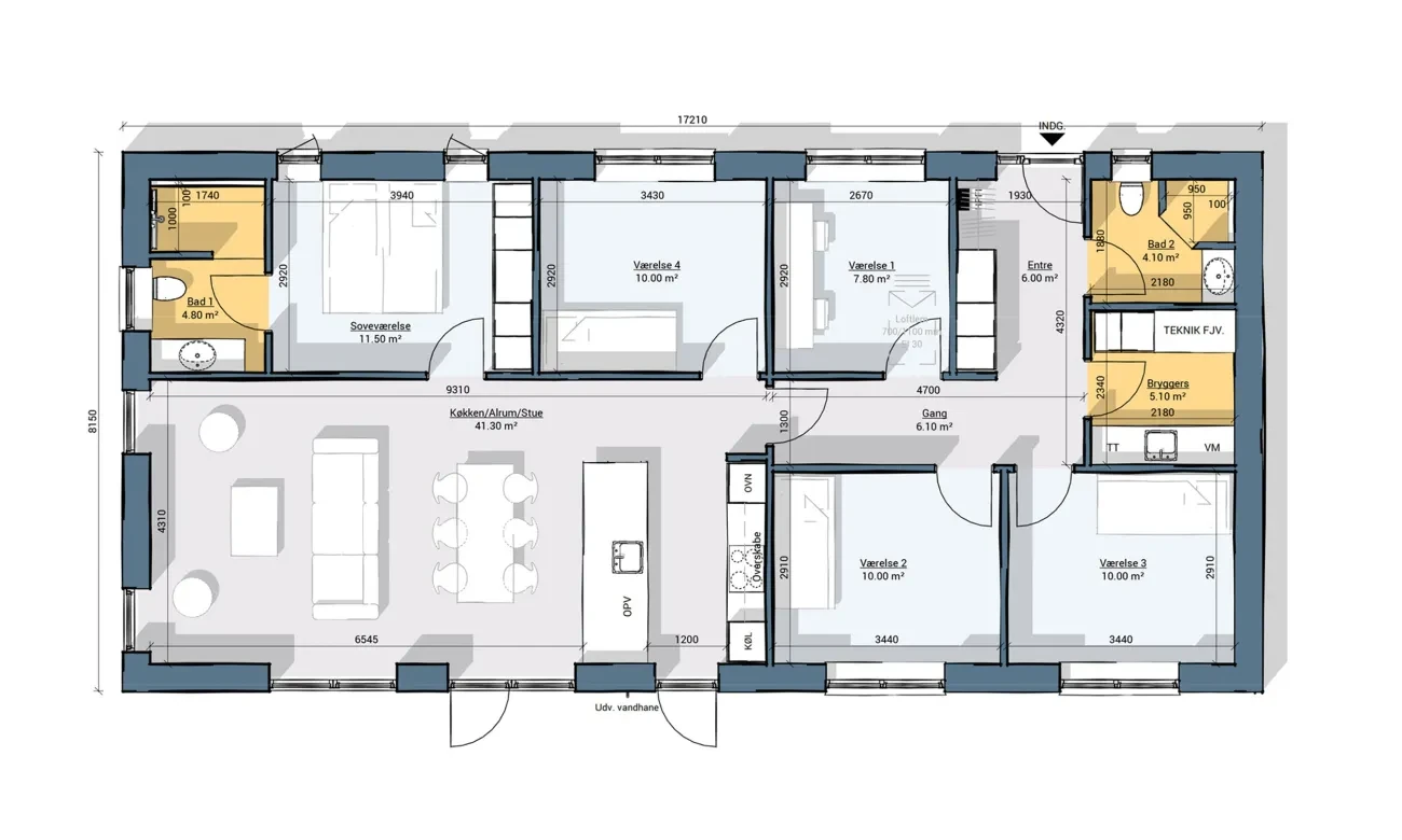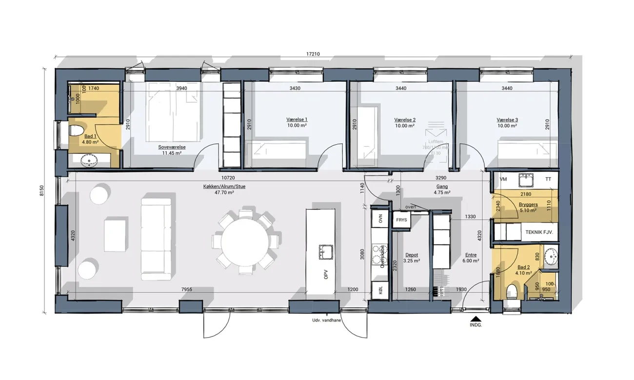 Få et længehus på 140 optimalt udnyttede kvadratmeter med tre gode værelser, depot, stort bryggers og garderobe.
