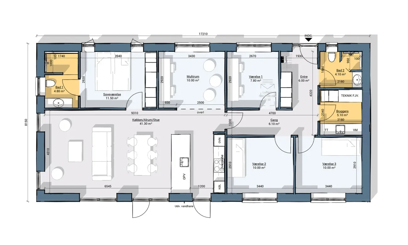 Det er ikke muligt at lave individuelle ændringer på planløsningen, men vi har valgt et længehus, hvor kvadratmeterne er optimalt udnyttet – og så har vi skabt tre varianter af huset, så det passer til netop jeres ønsker.