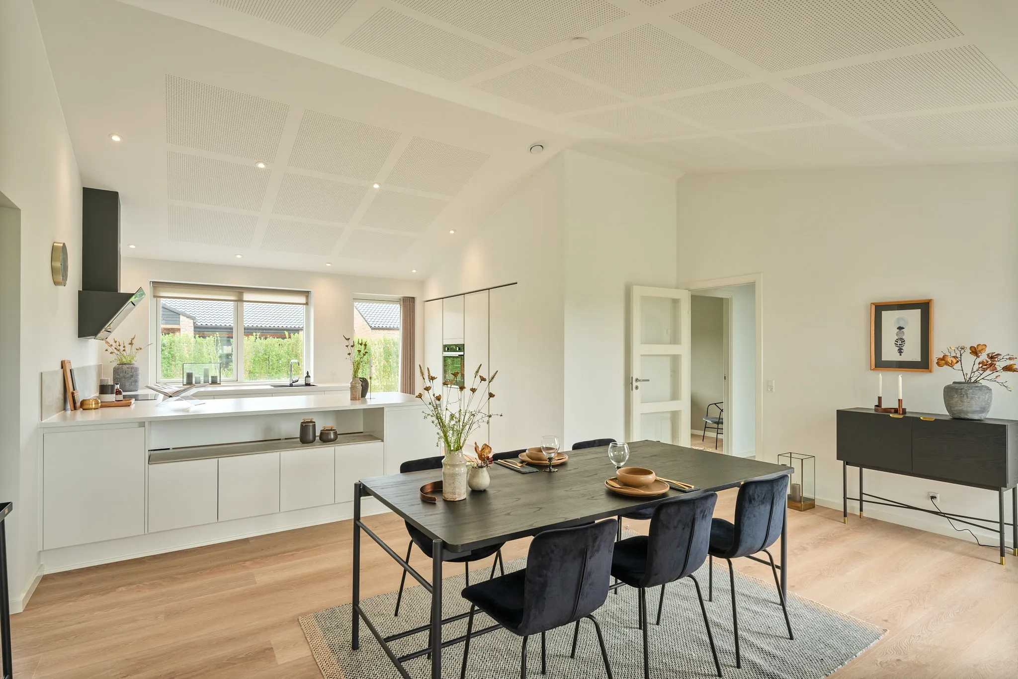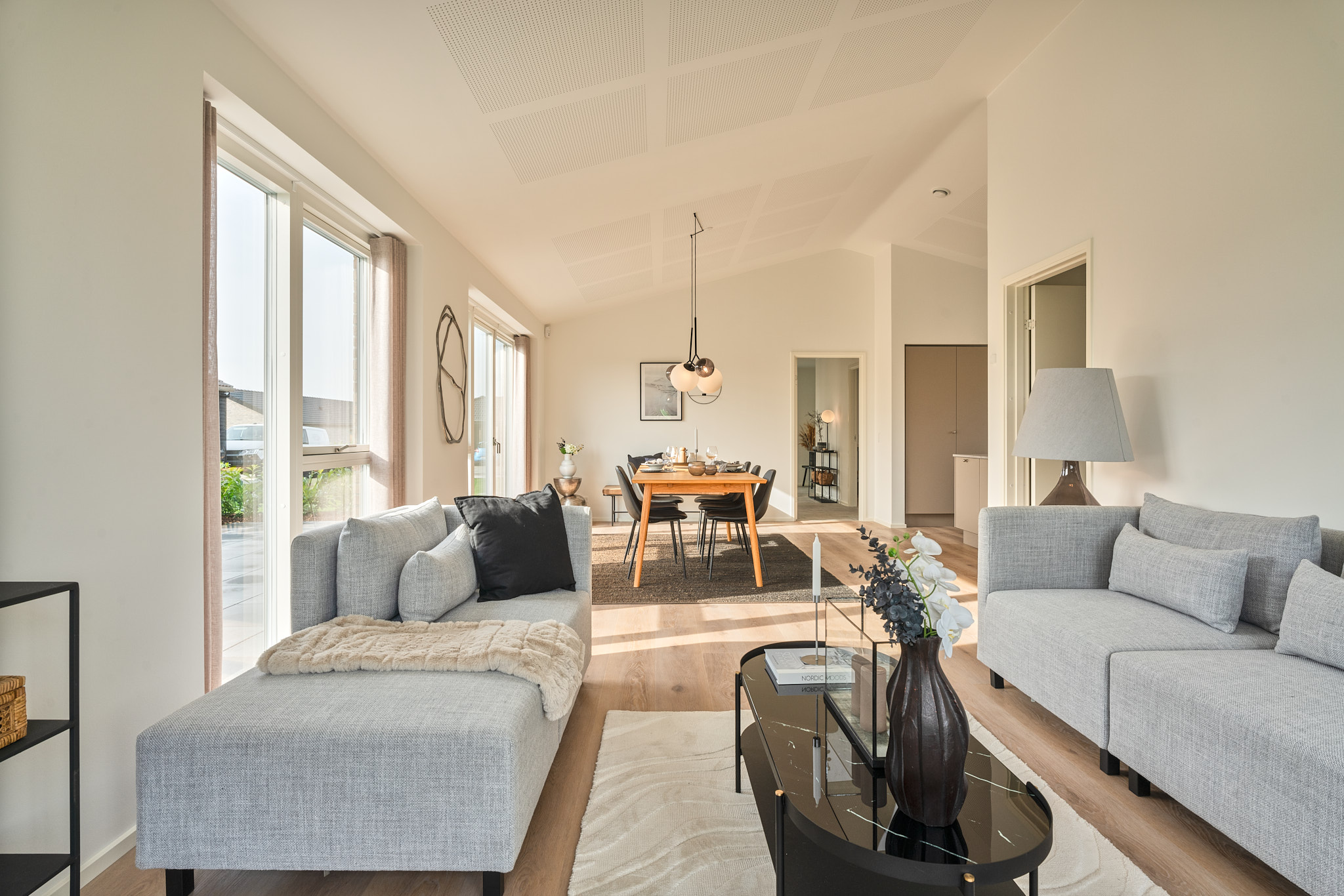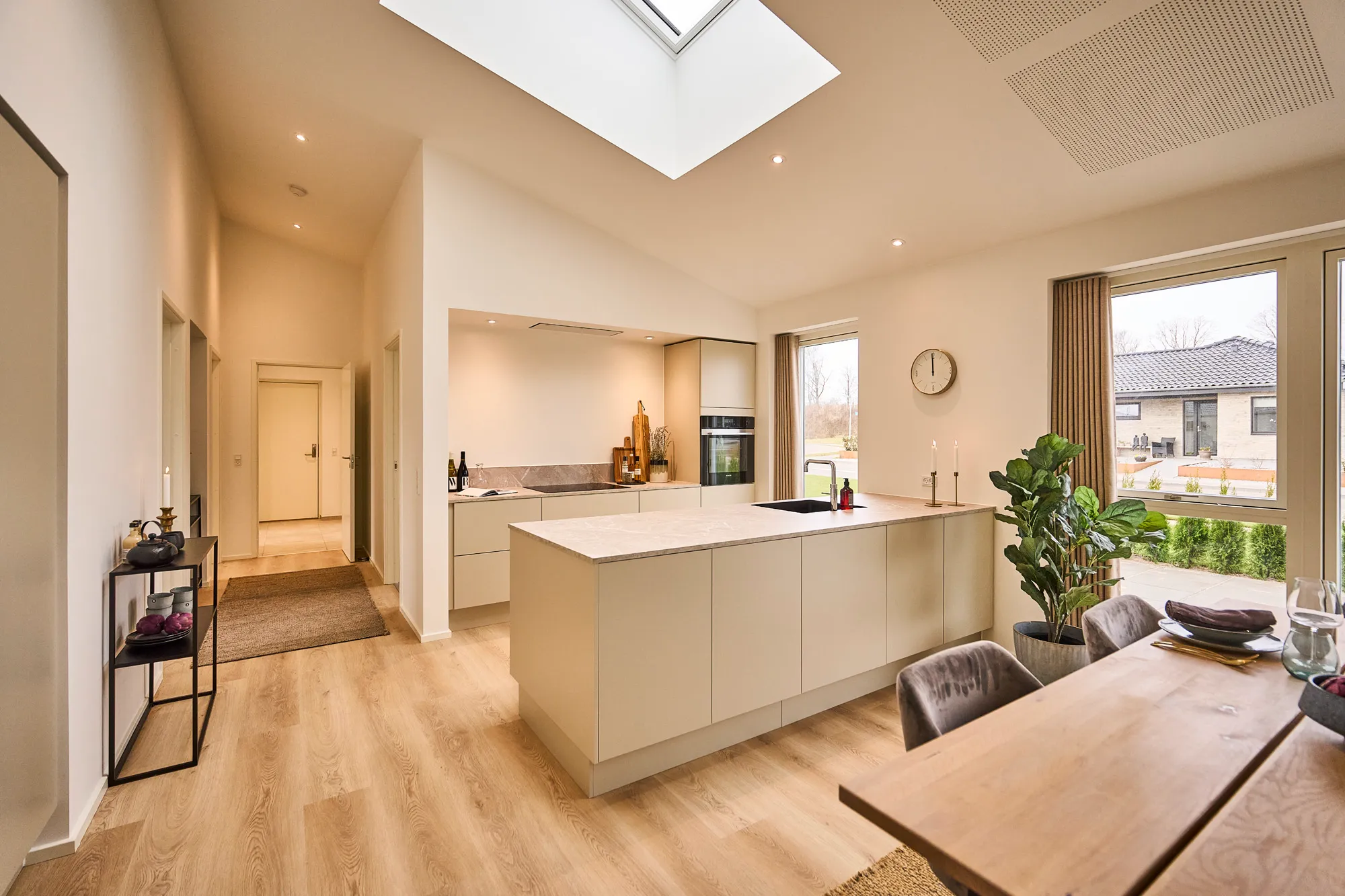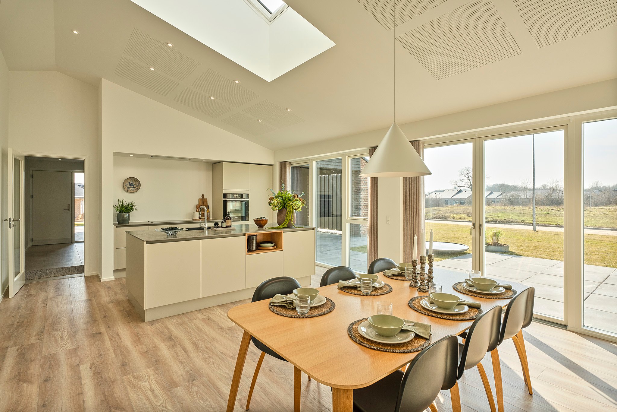 Skålofter fra entréen til køkken-alrum og et ovenlysvindue der bringer dagslys ind, og skaber en stemning af varme og velvære. Forestil dig at stå i dit køkken, mens solen strømmer ned fra oven, eller at nyde en bog i stuen med naturligt lys, der gør alt lidt mere behageligt, samtidig med at vinduer ventilere på varme dage.