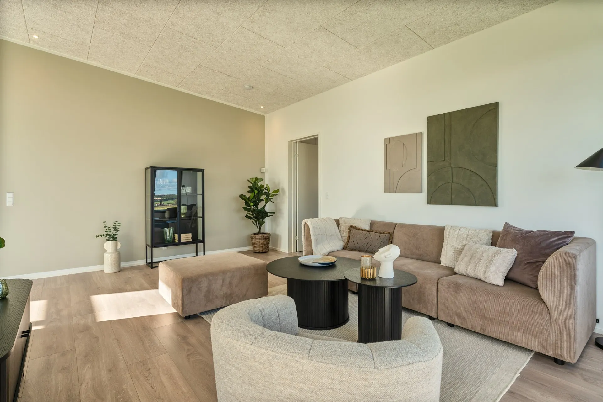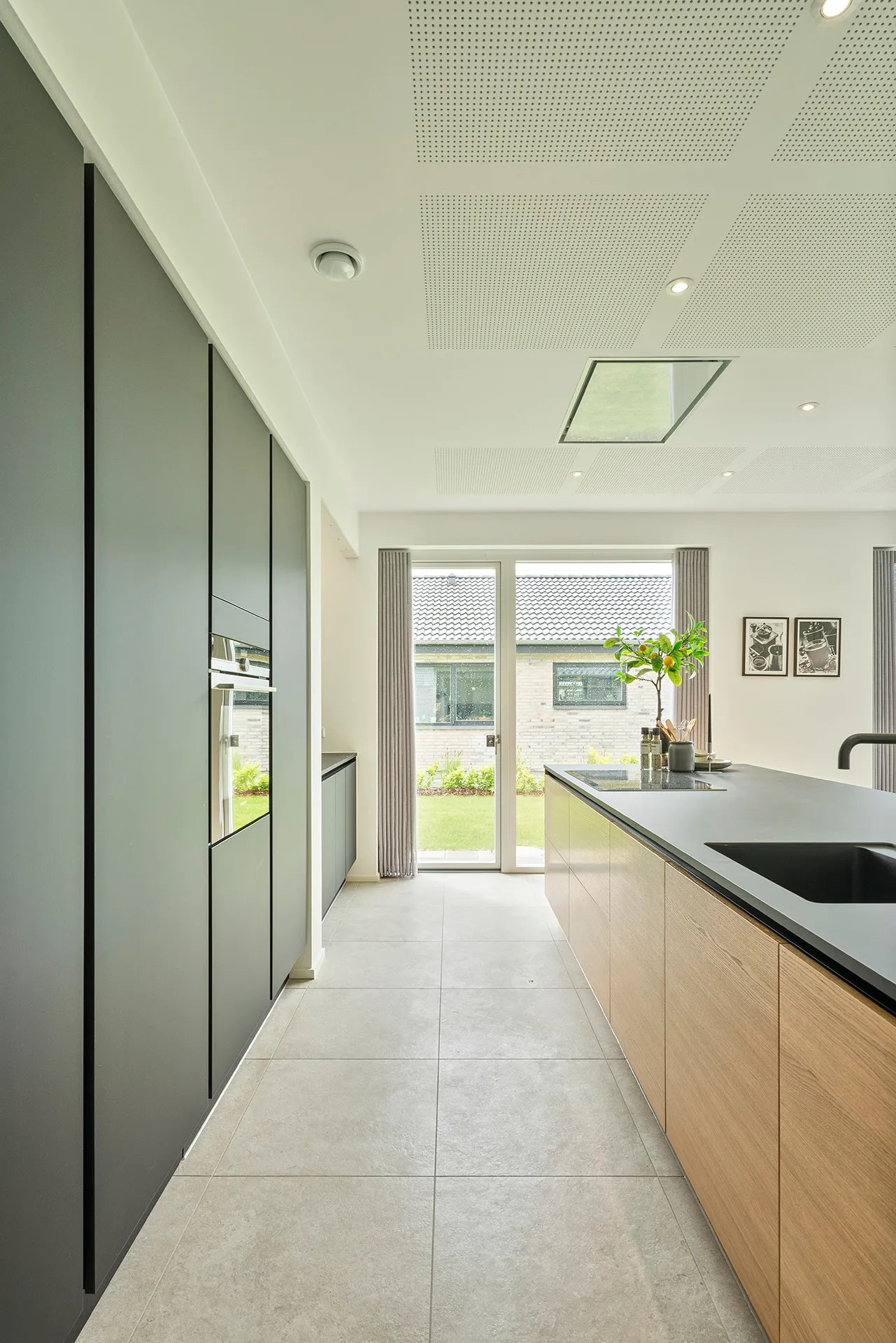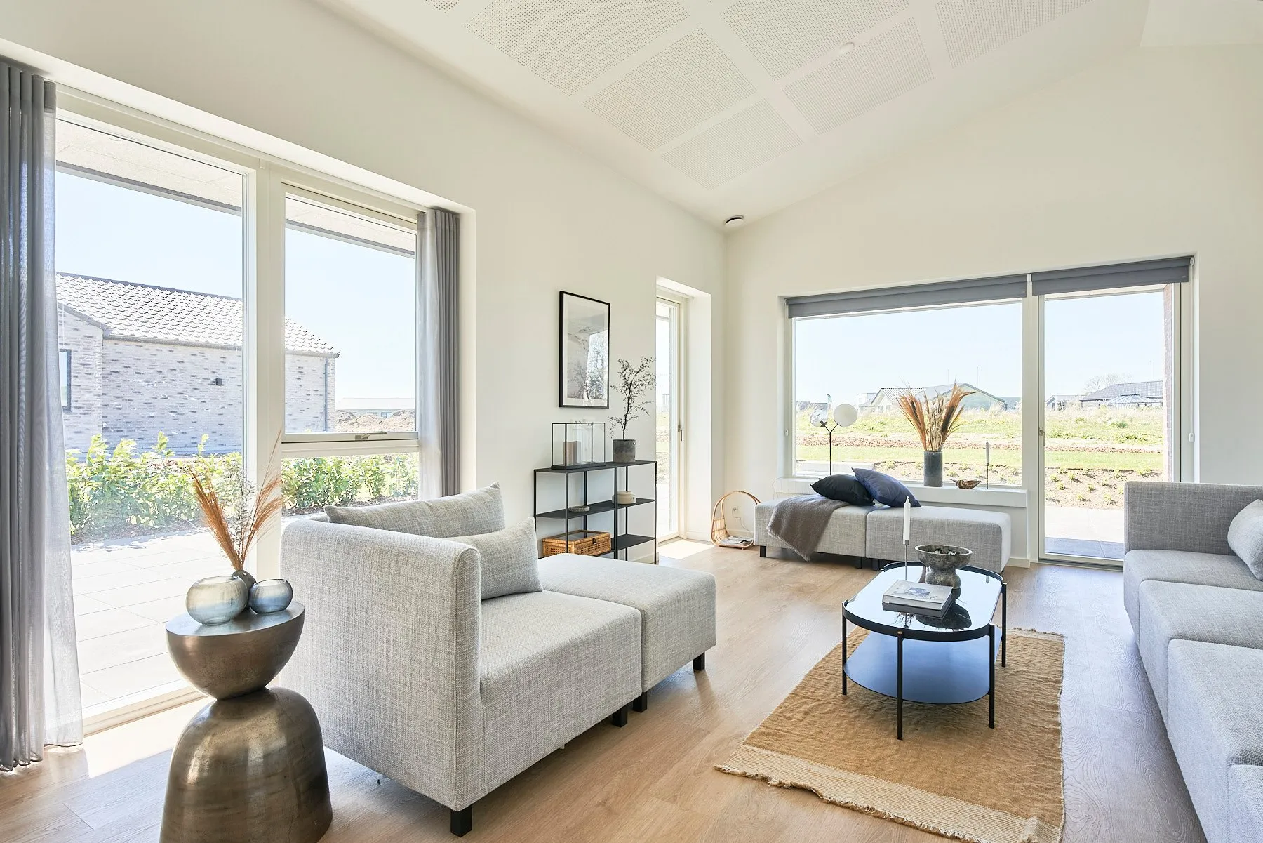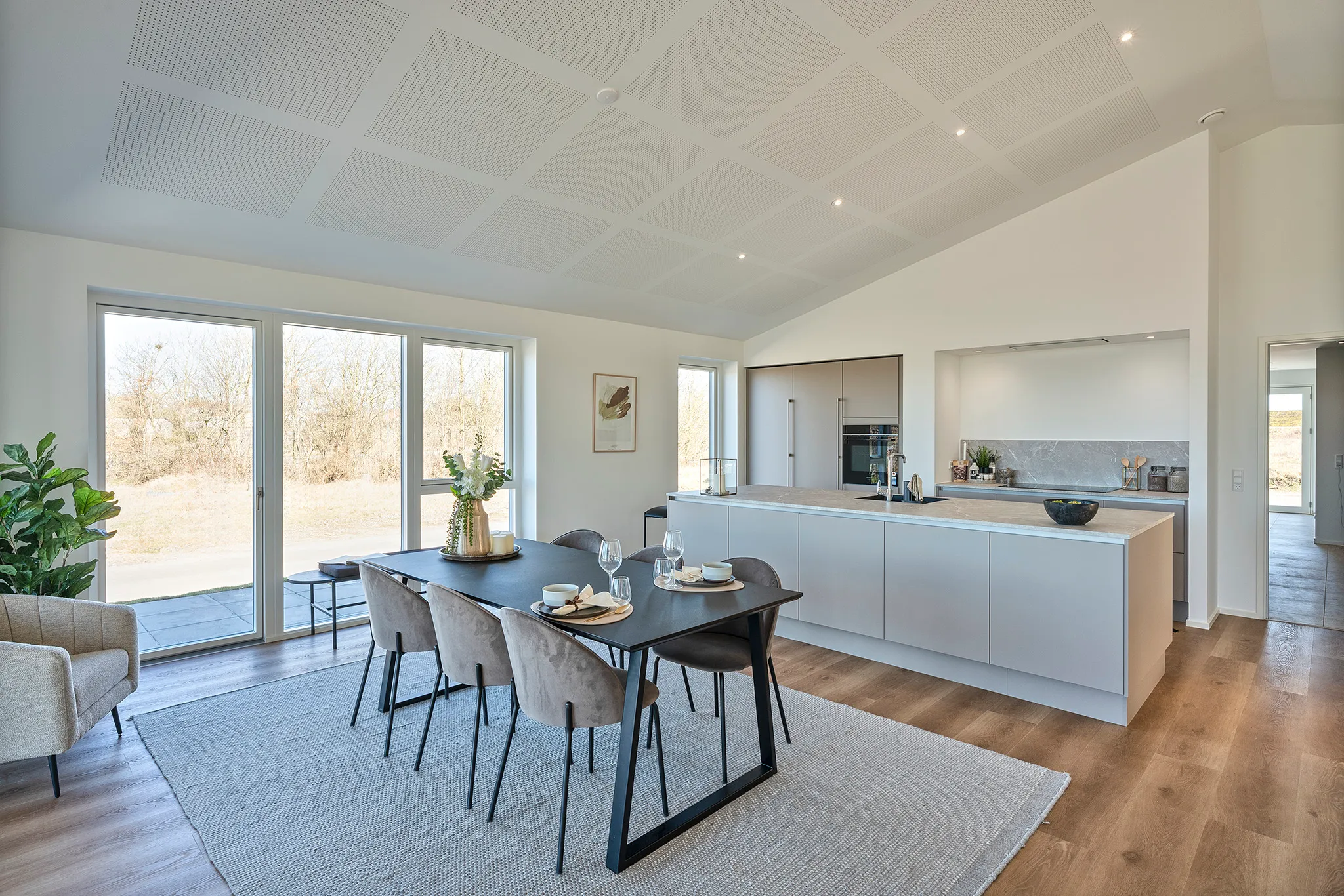 Skålofter fra entréen til køkken-alrum og et ovenlysvindue der bringer dagslys ind, og skaber en stemning af varme og velvære. Forestil dig at stå i dit køkken, mens solen strømmer ned fra oven, eller at nyde en bog i stuen med naturligt lys, der gør alt lidt mere behageligt, samtidig med at vinduer ventilere på varme dage.
