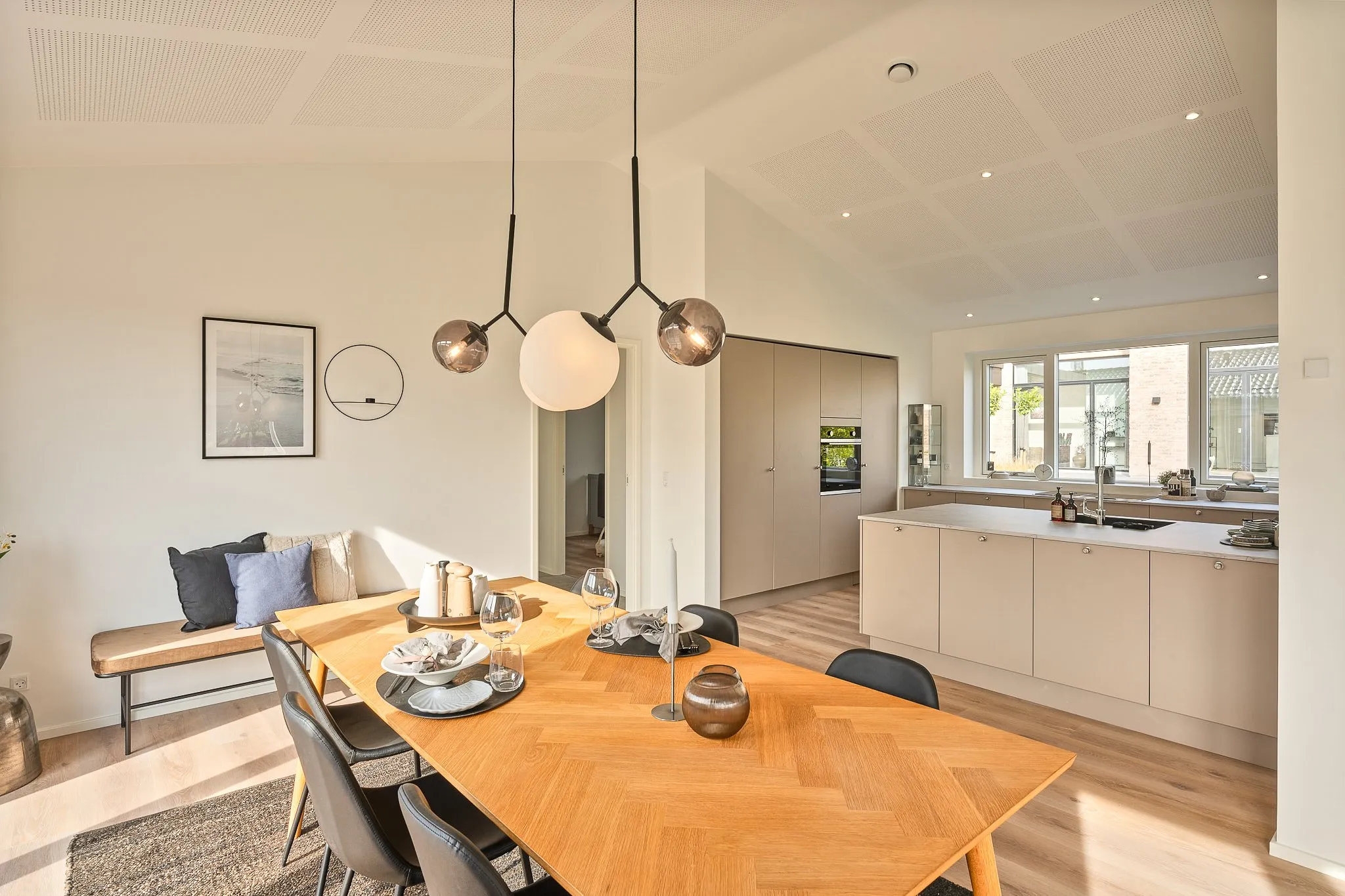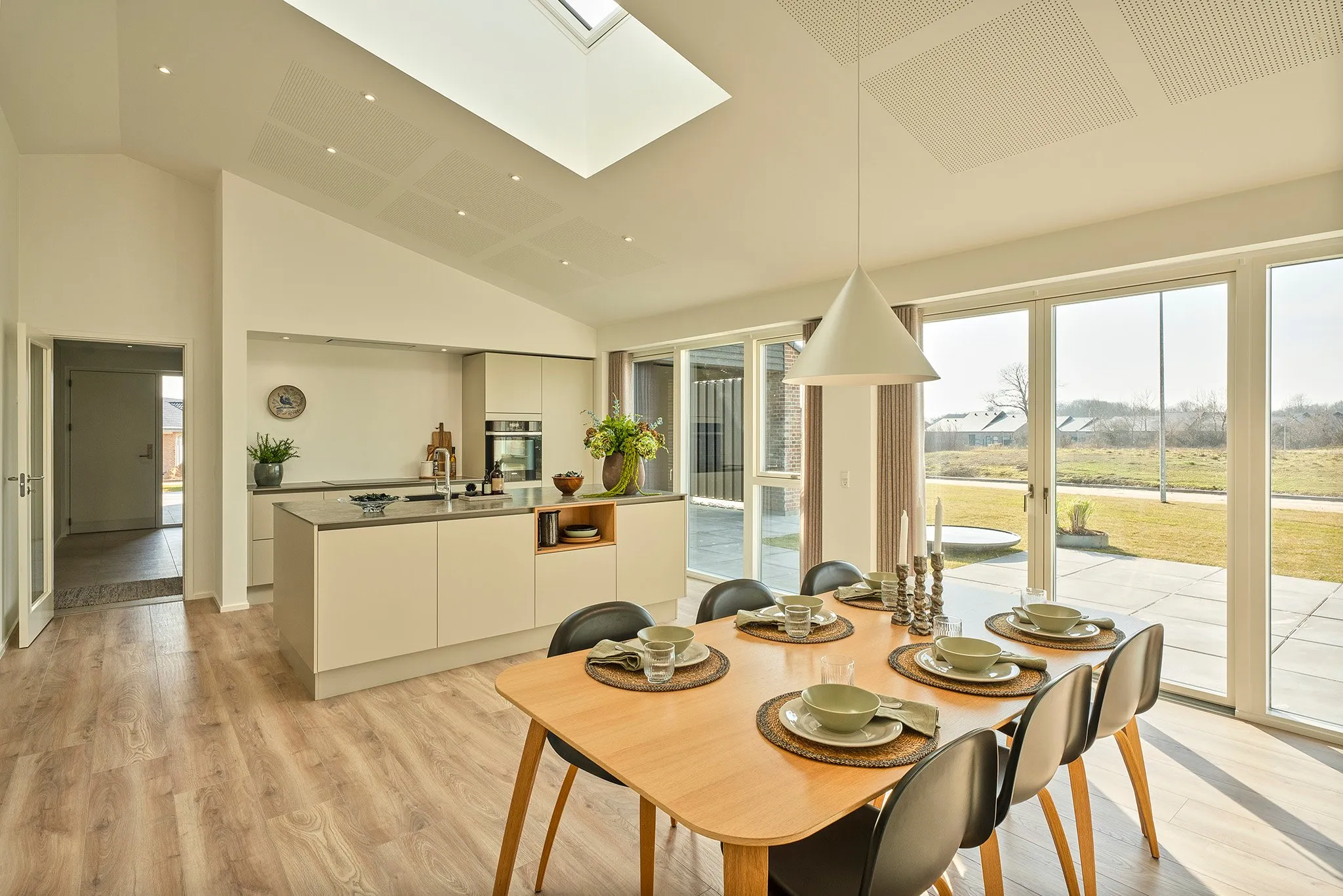Skålofter fra entréen til køkken-alrum og et ovenlysvindue der bringer dagslys ind, og skaber en stemning af varme og velvære.