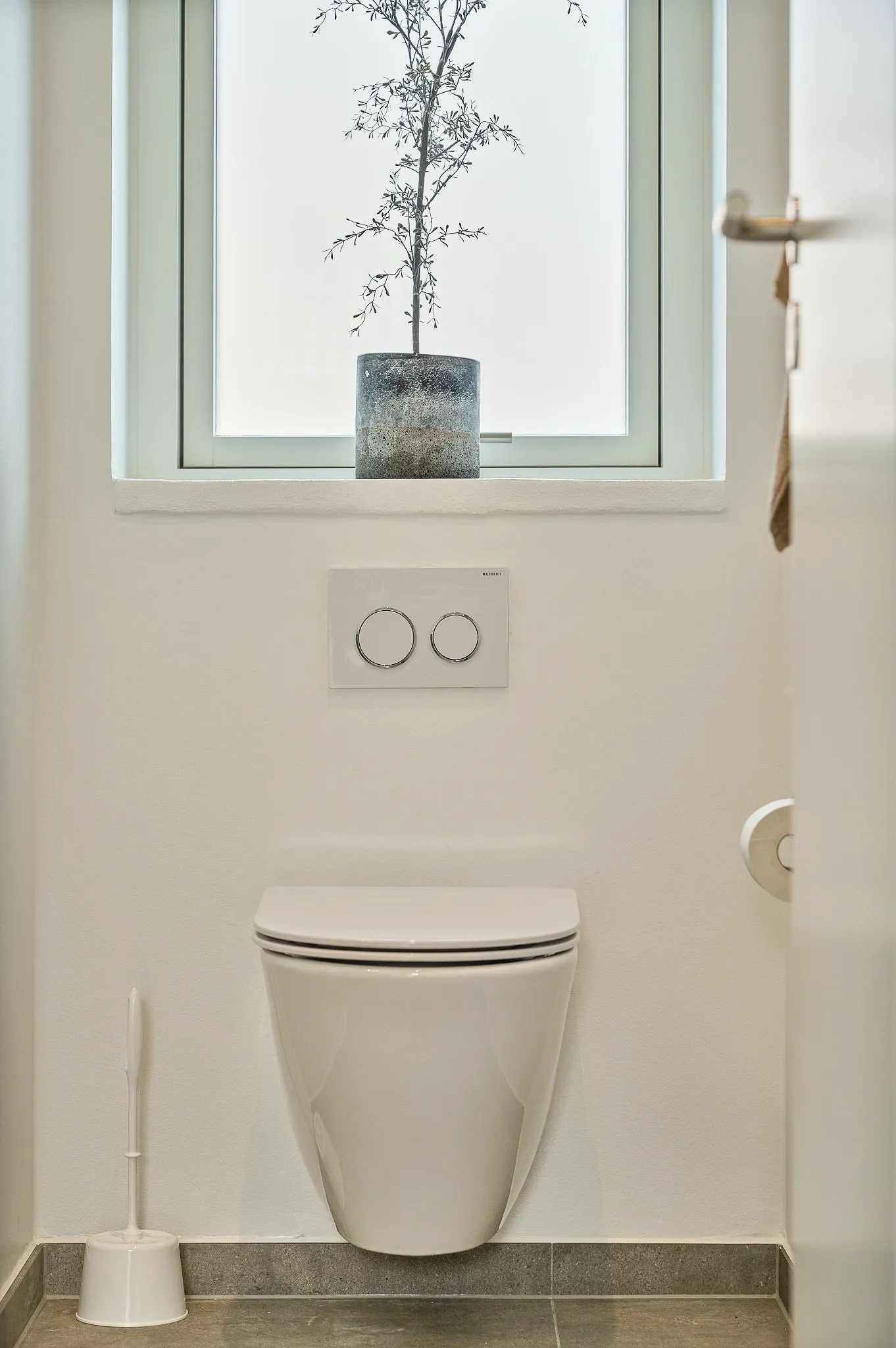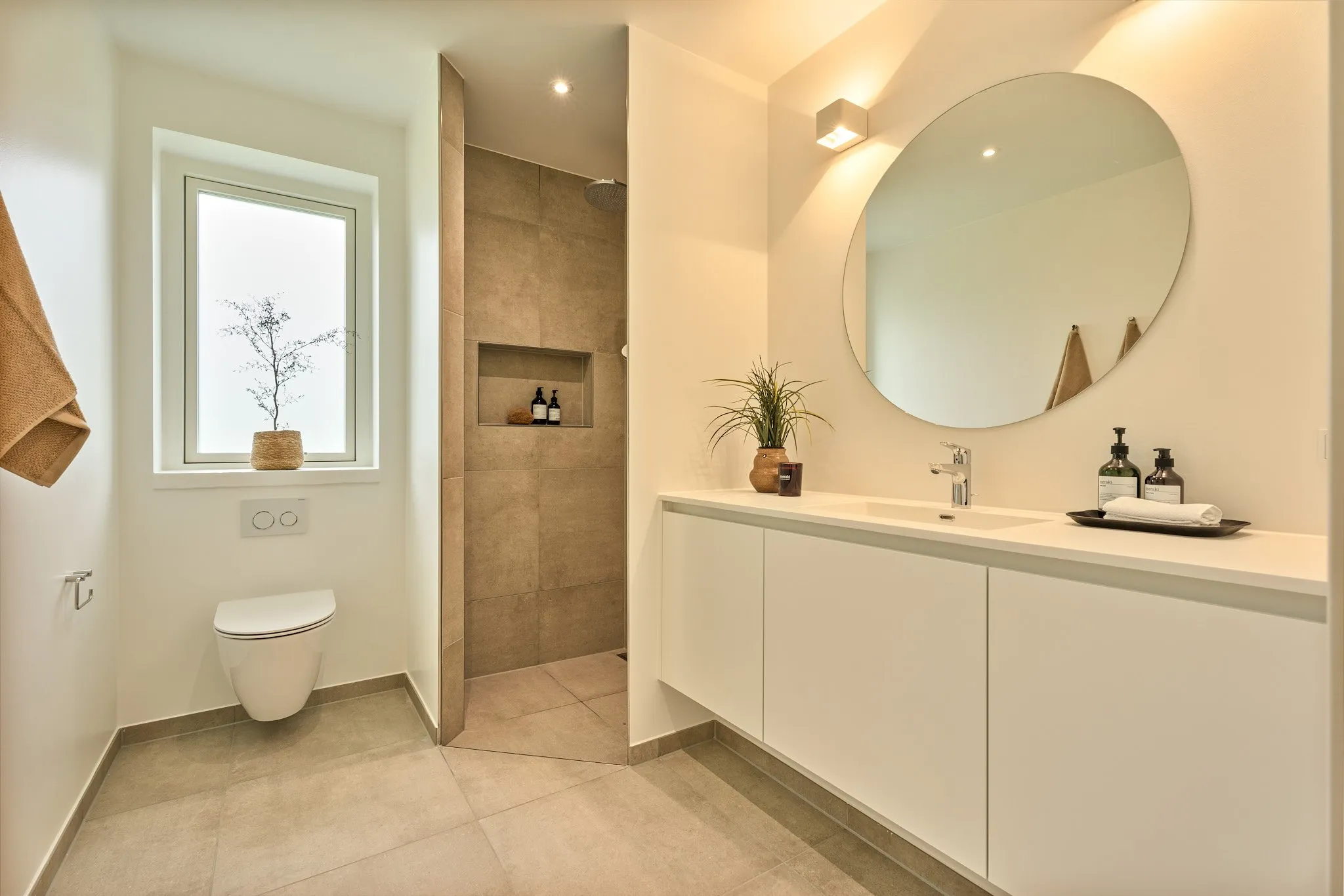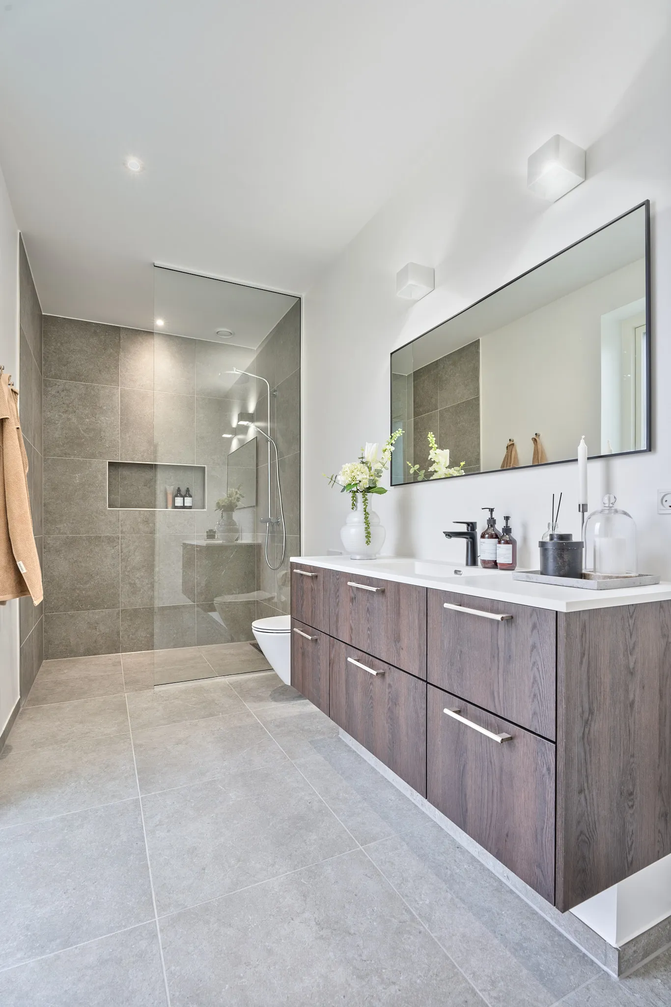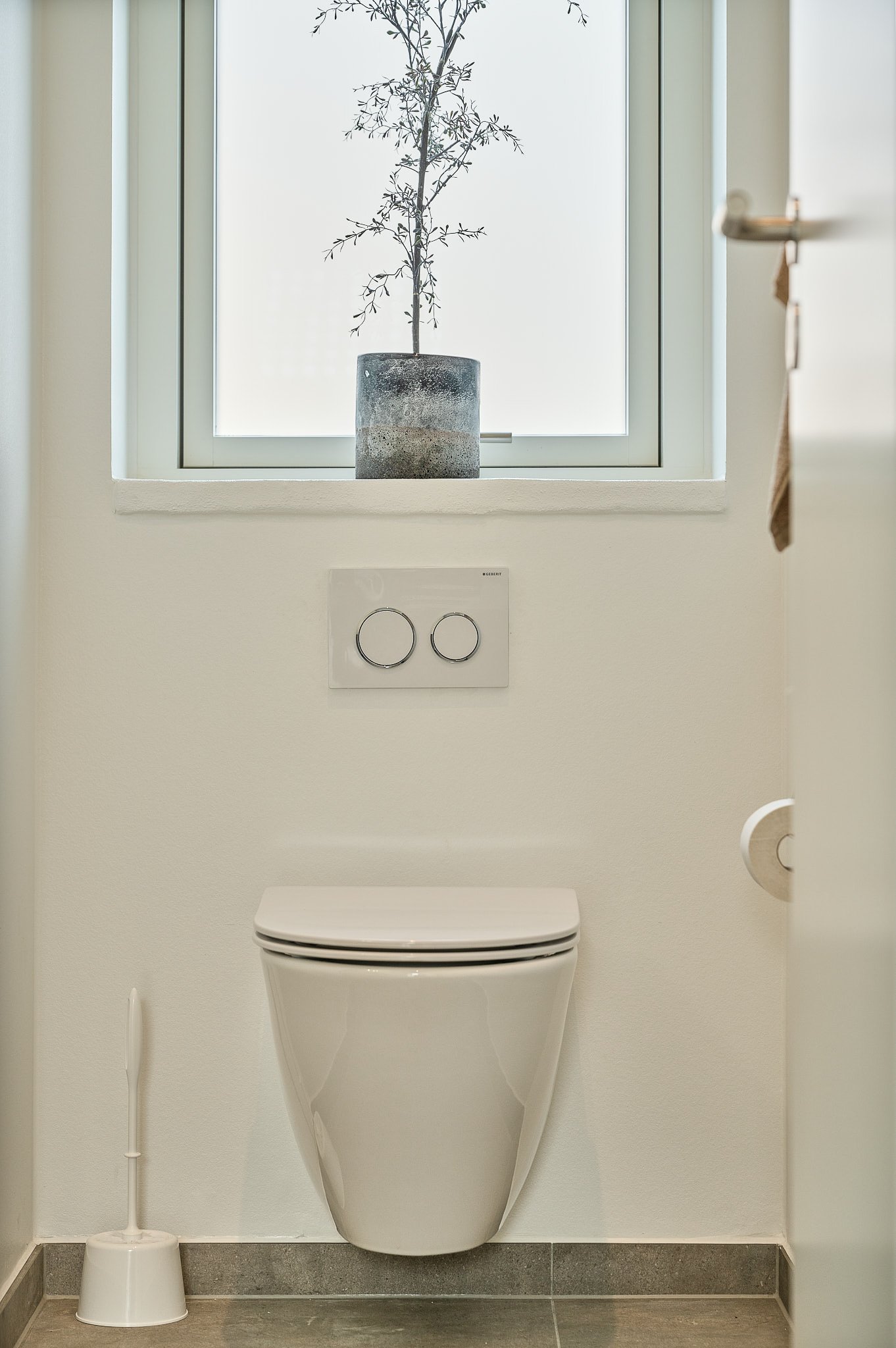 Få væghængte toiletter med skjult cisterne på begge badeværelser samt rainshower og shampoohylder.